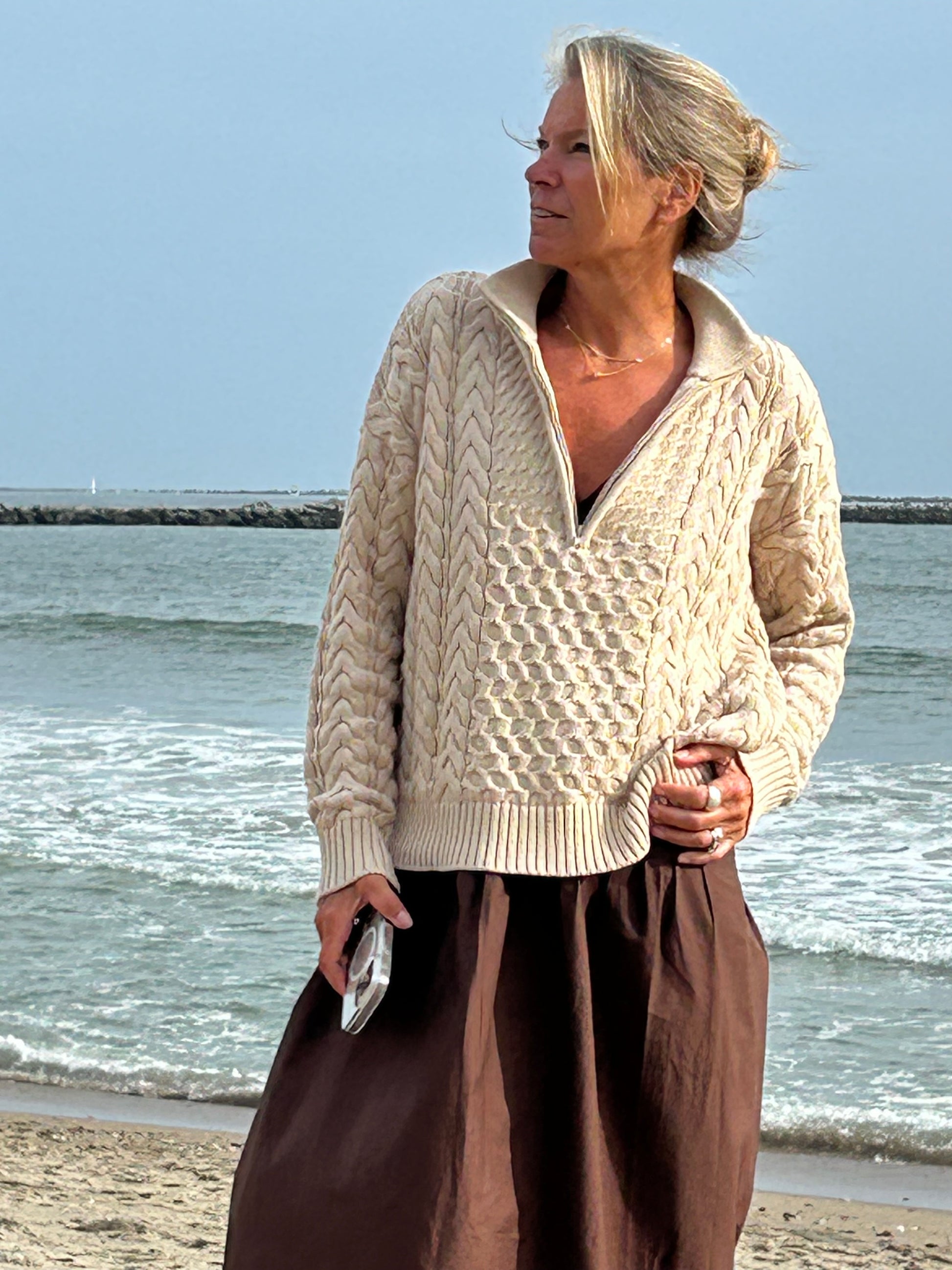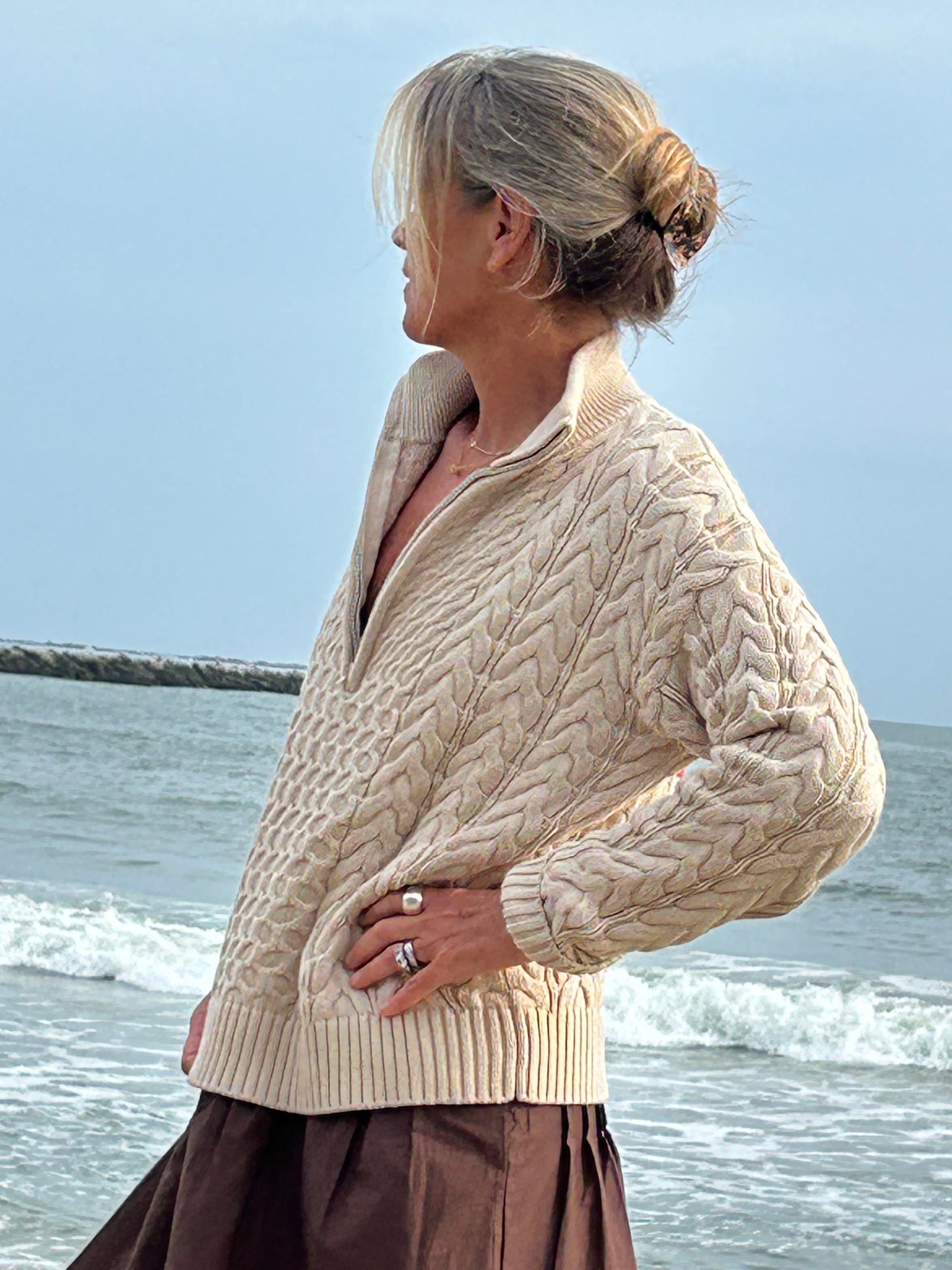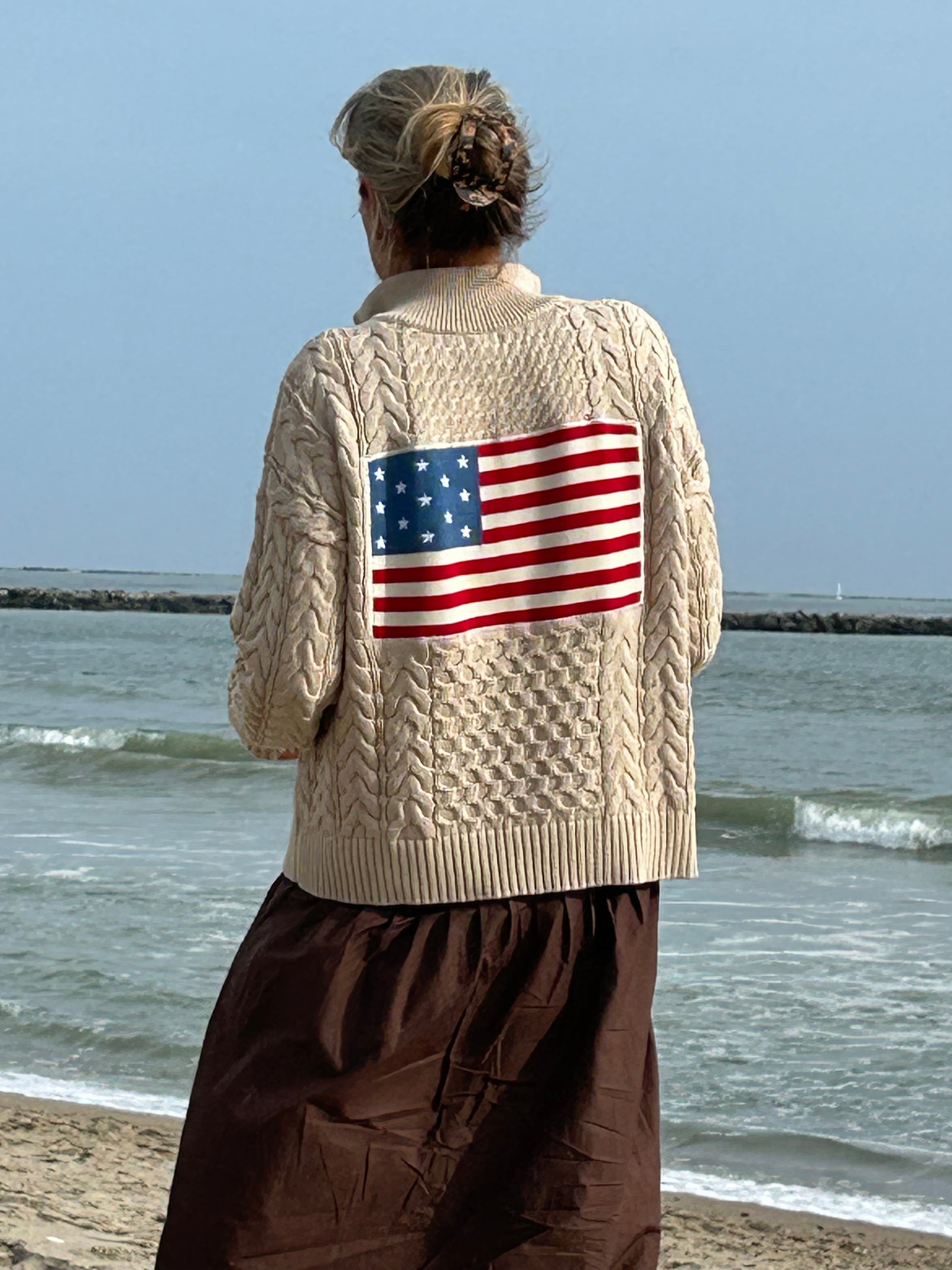 100% cotton 100% Perfection - this sweater is FOR SURE going to be your go to all year long! 100% super soft Lux cotton crafted into a full cable with an extended front zipper and a vintage hued American flag knit in on the back. A MUST HAVE - Why wear the basic flag crew that the entire world now owns when you can have this masterpiece!