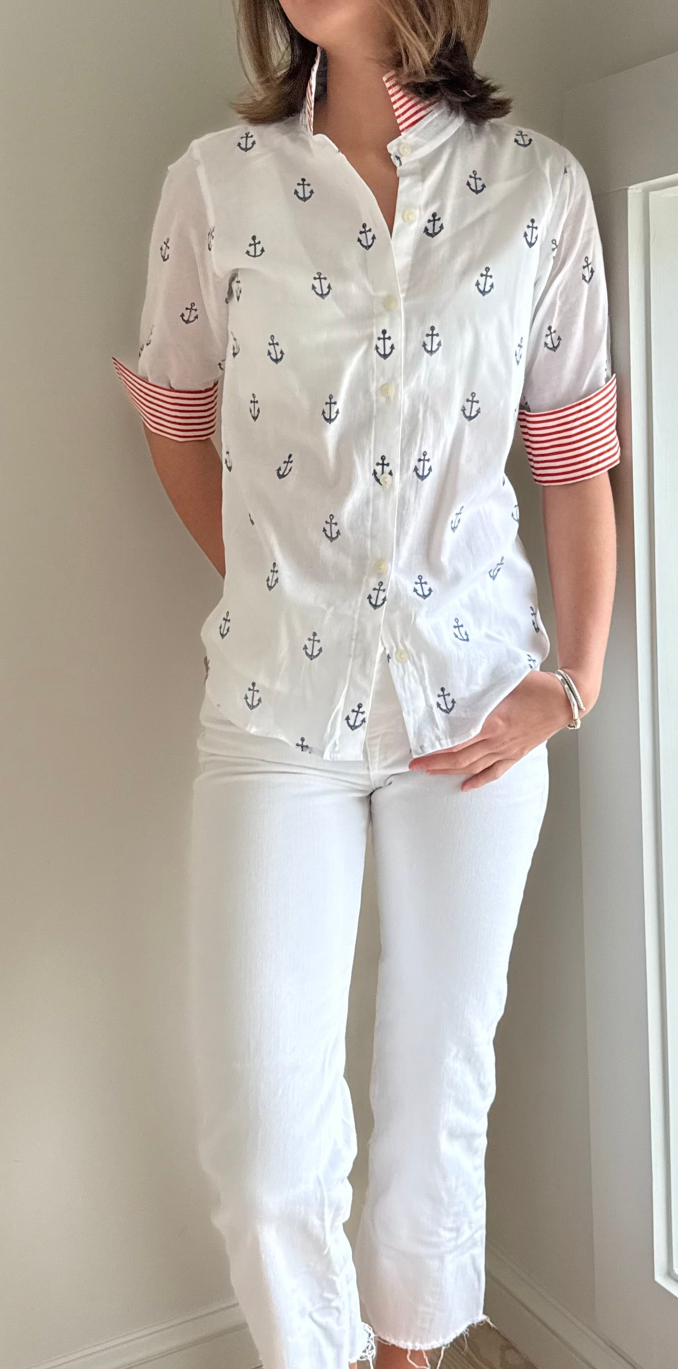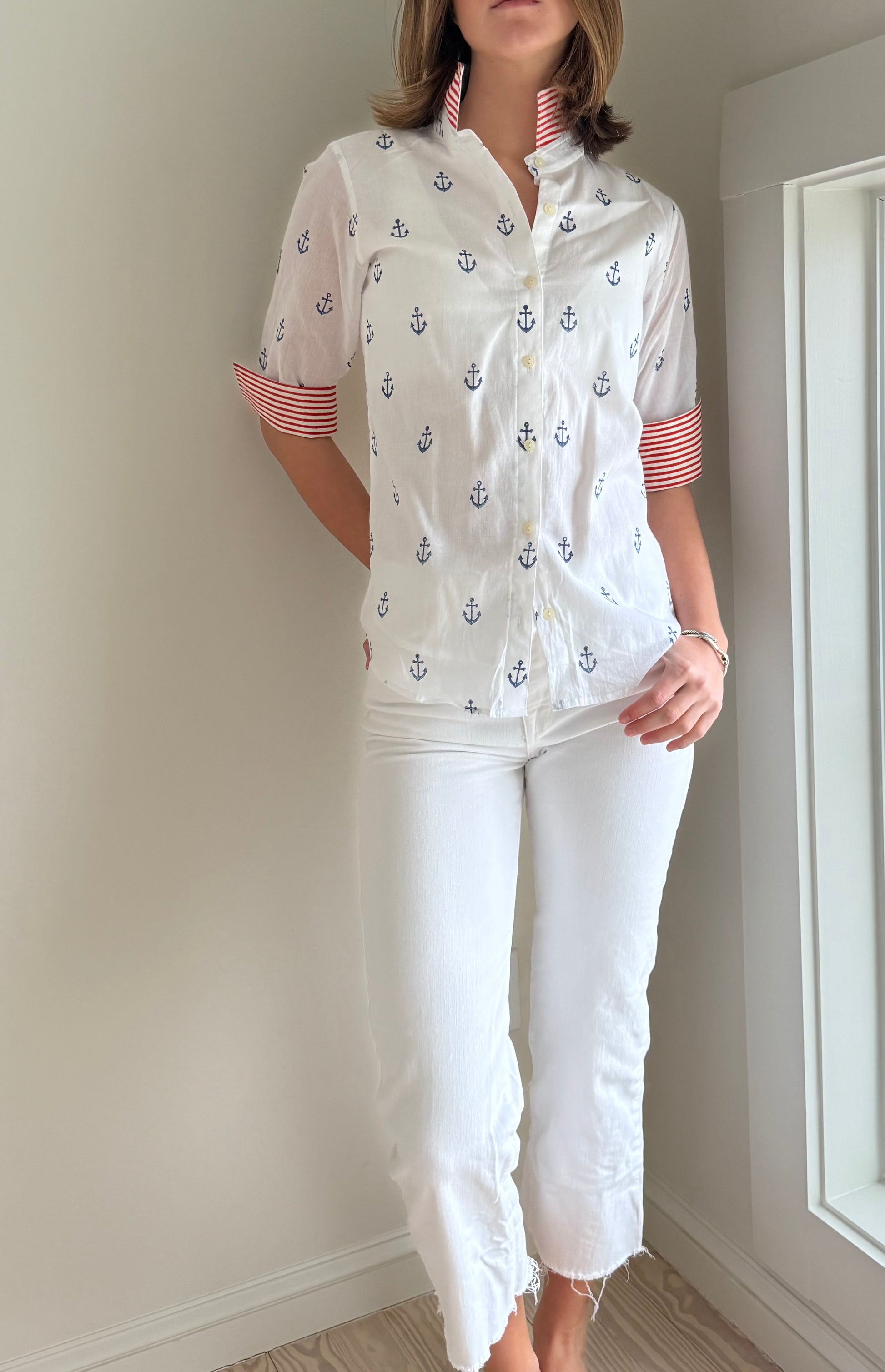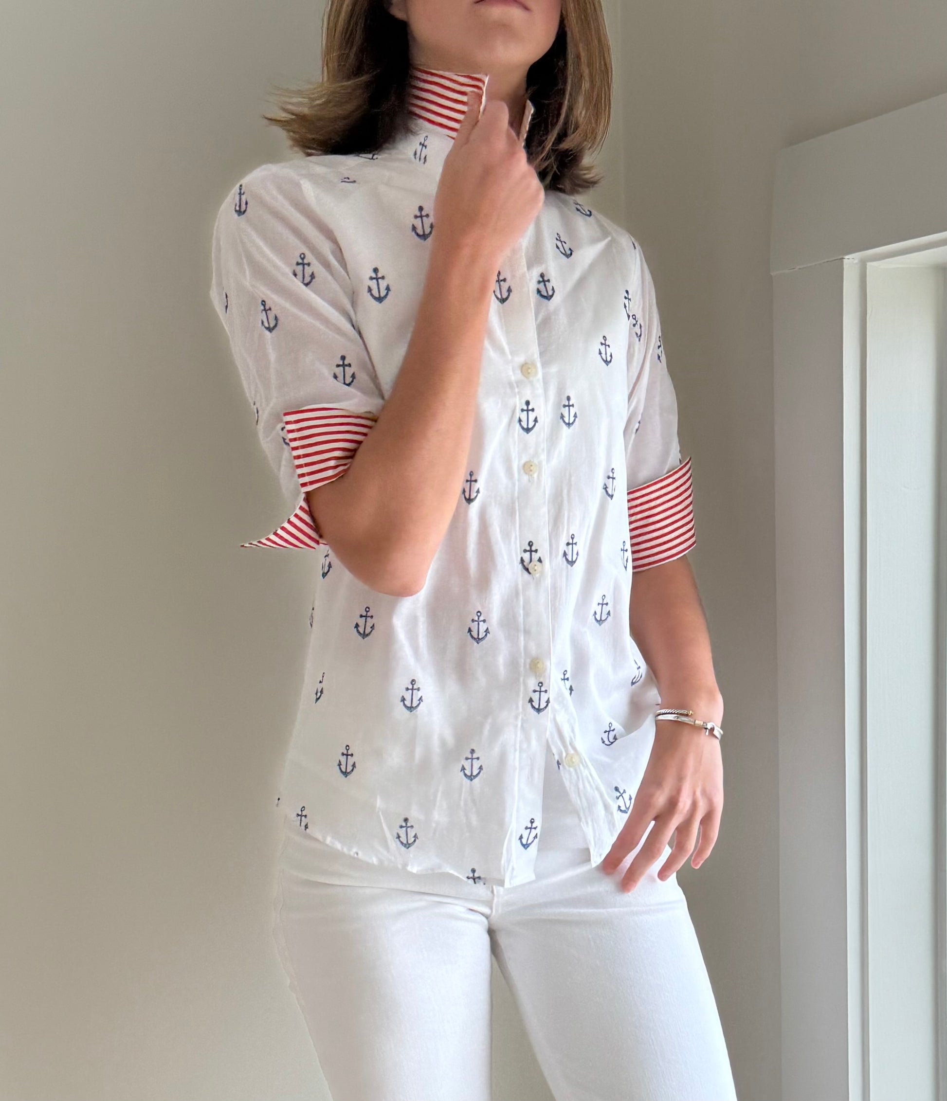 3/4 Sleeve Cotton Anchor Print Blouse