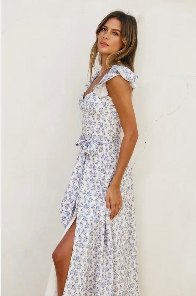 Turn heads in our Aimee Floral Bustier Maxi Dress! With its unique floral pattern and bustier design, this dress is sure to make a statement. Perfect for any event, this dress will make you feel confident and beautiful. This lilac maxi dress features a bustier style bust, a smocked back, adjustable ruffle sleeves, an adjustable self-tie belt, a side slit, and a back zipper closure.