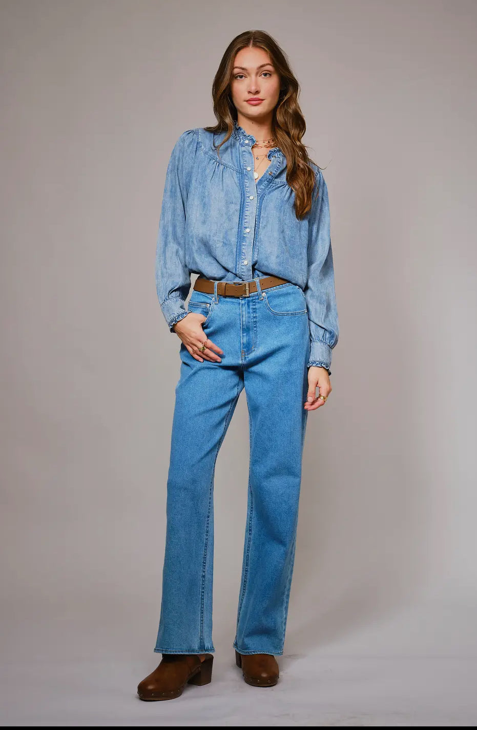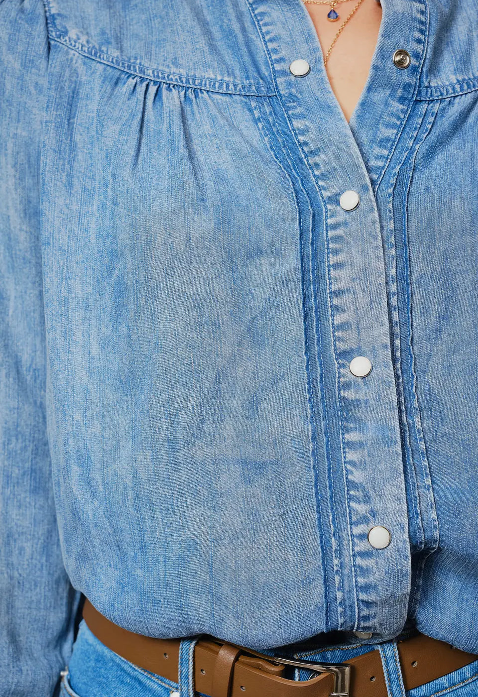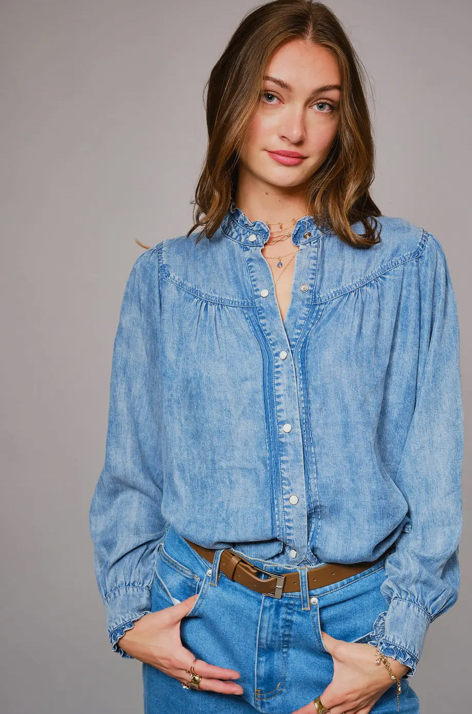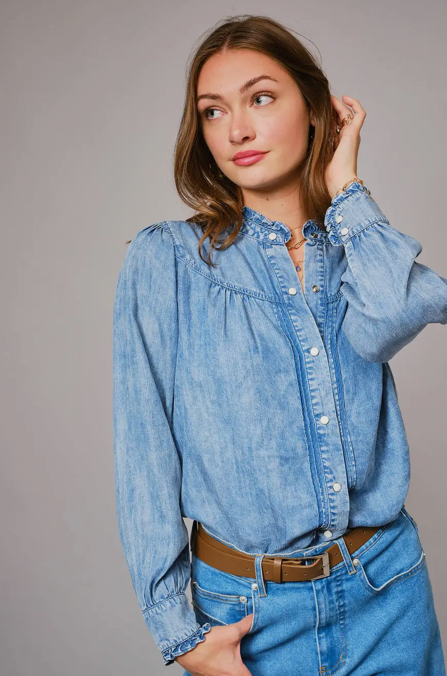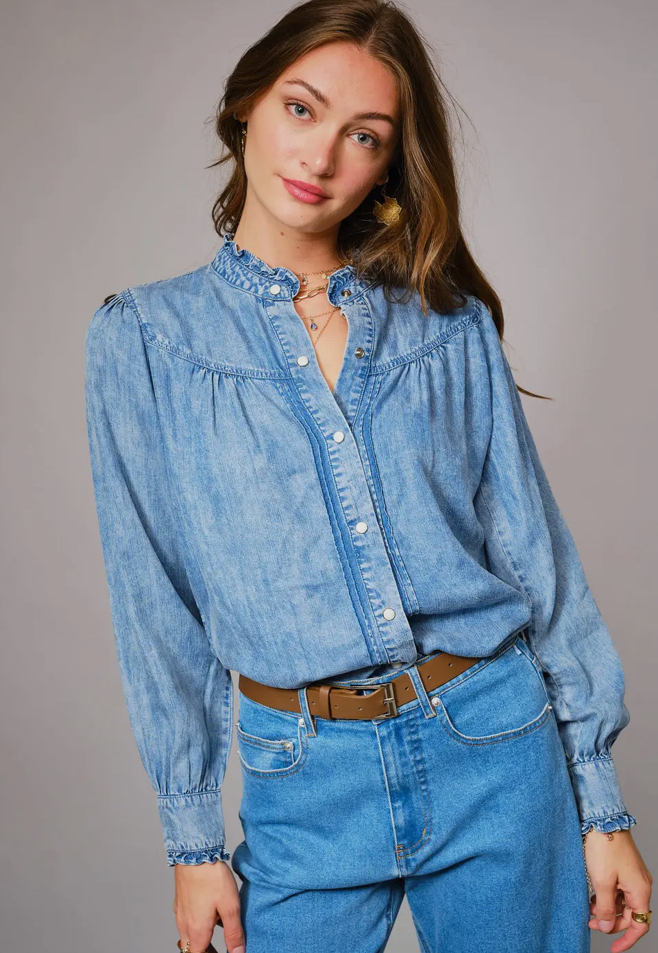 Finished with ruffles at the collar and cuffs, the Alyssa Shirt is crafted in soft lyocell-blend denim with a seamed yoke, front snap closures, and long puff sleeves. Tuck into cargo pants, or pair with jeans for a denim-on-denim look.