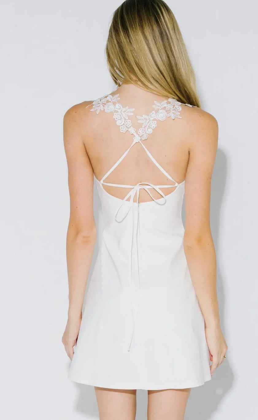 A little romantic, a little ethereal — the Angel On Arrival Mini Dress feels like stepping into soft sunlight. The delicate floral lace straps float on the skin, while the sculpted bodice and clean A-line silhouette create that effortless, feminine shape everyone loves. The adjustable crisscross back adds the prettiest detail, giving you a custom fit with a touch of charm.