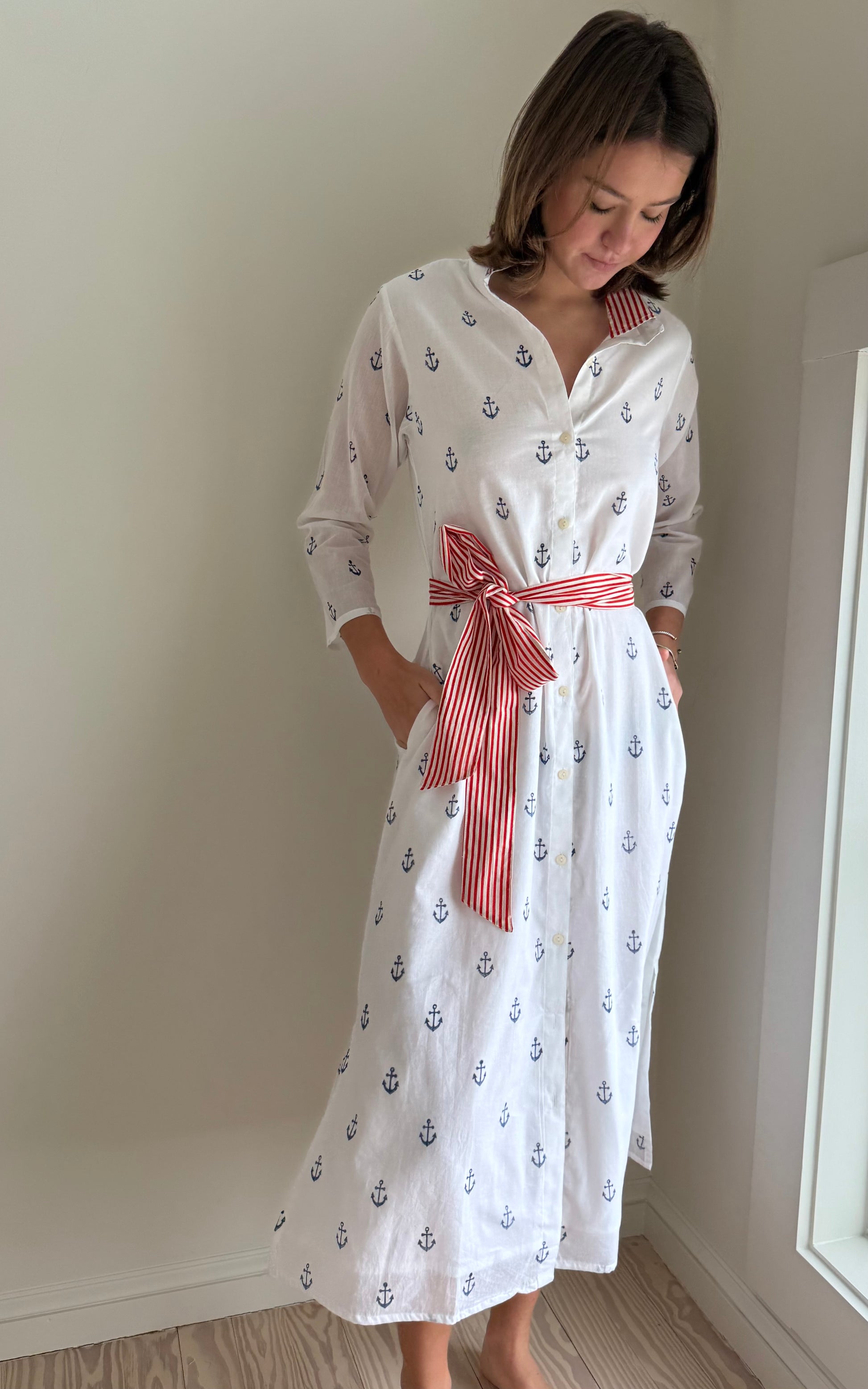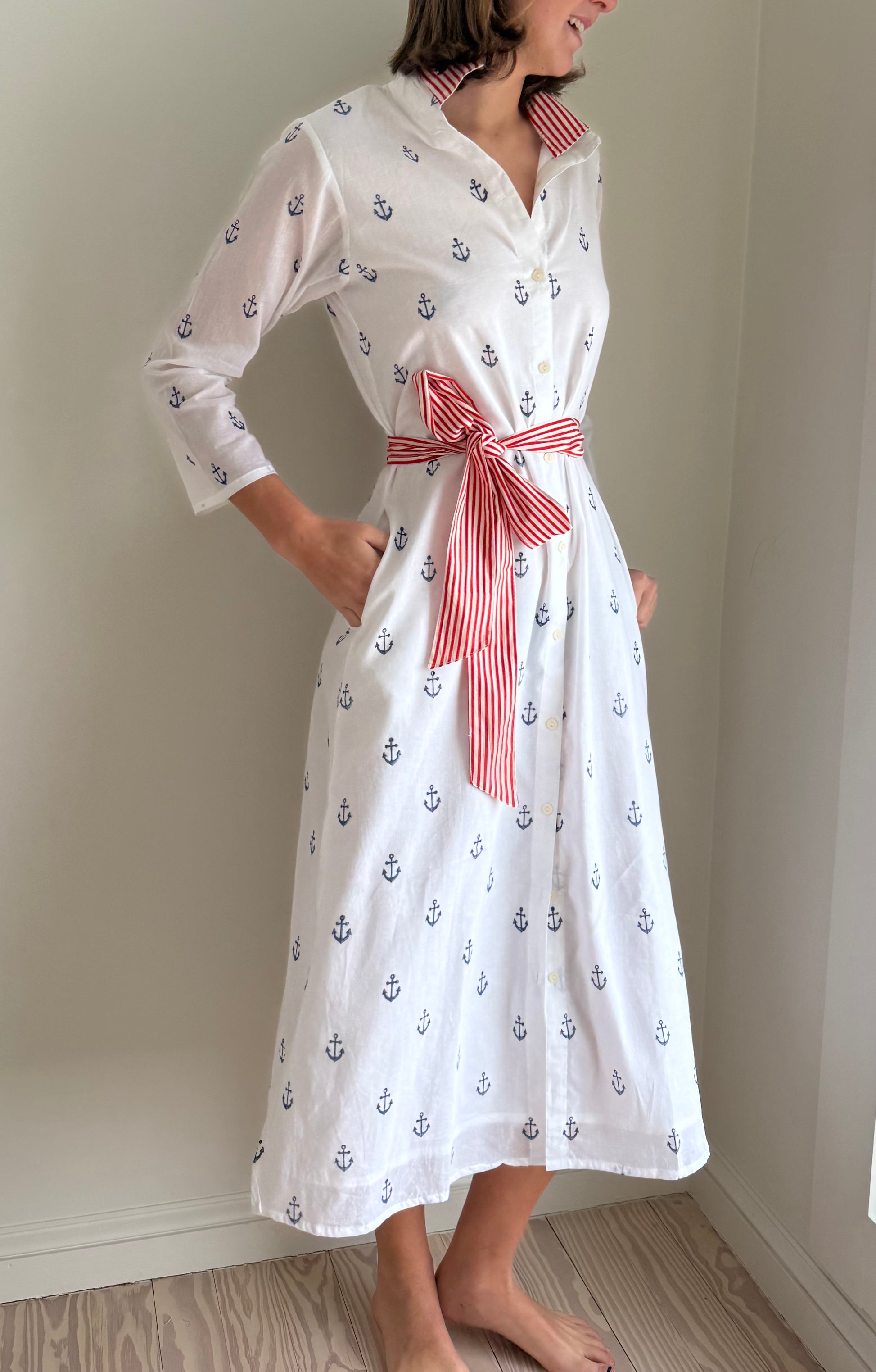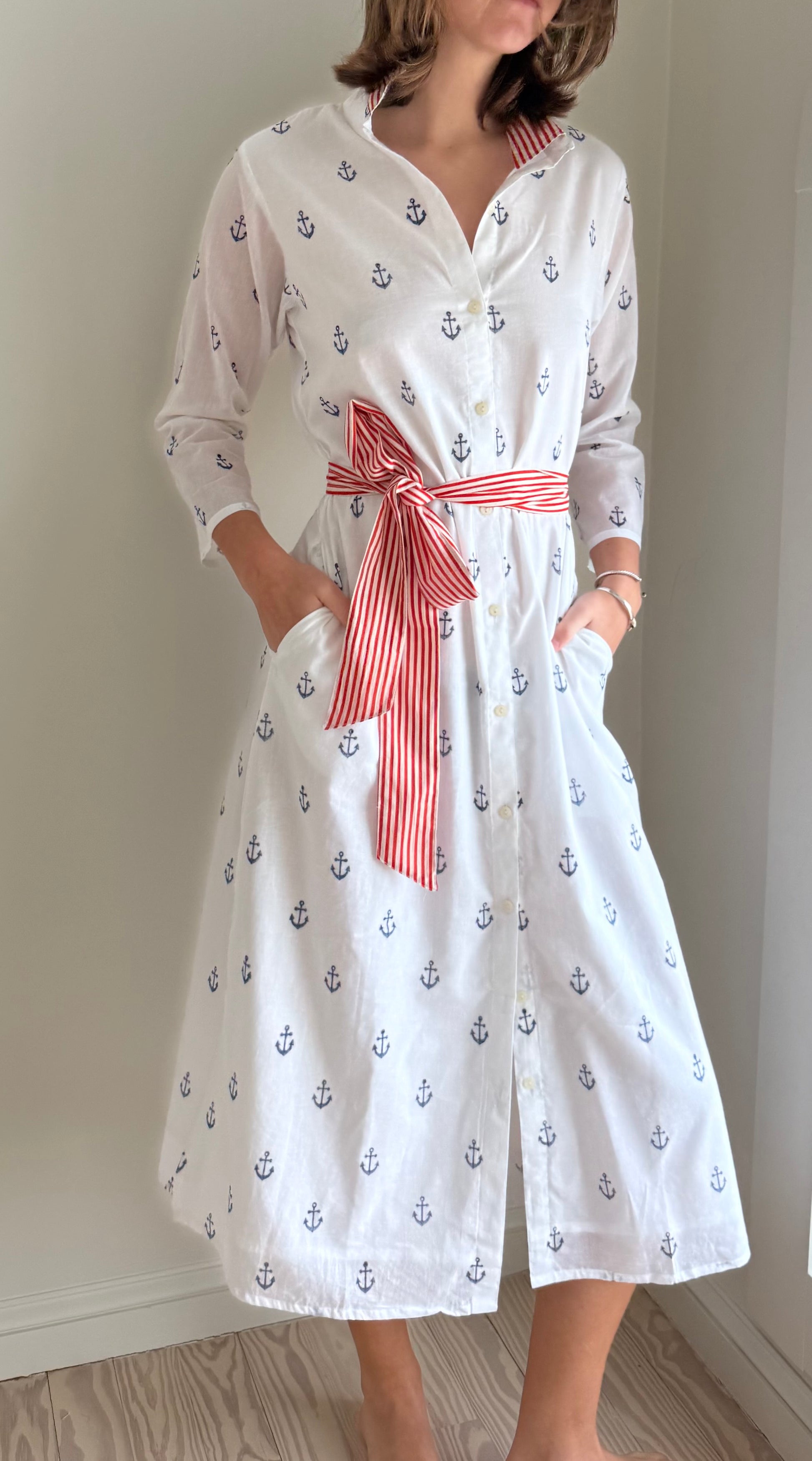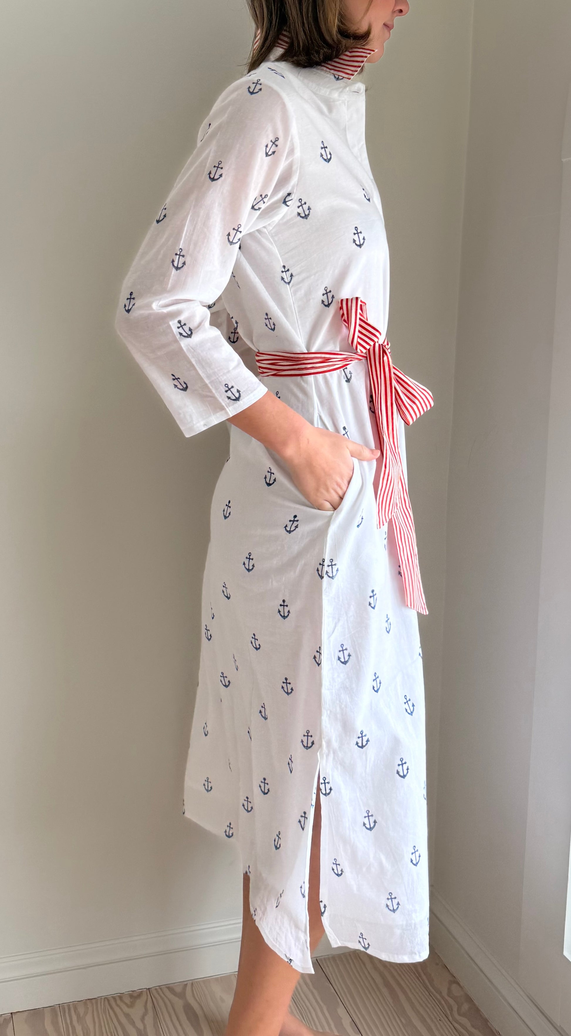 Pink Pineapple exclusive - 100% hand blocked cotton, fully lined, front button placket, slight A-line silhouette for an easy, carefree fit with a classic look. And of course with easy side seam pockets and matching sash - Weather your looking to cover up at the beach or dress it up for lunch at the club and of course 4th of July this dress is a MUST