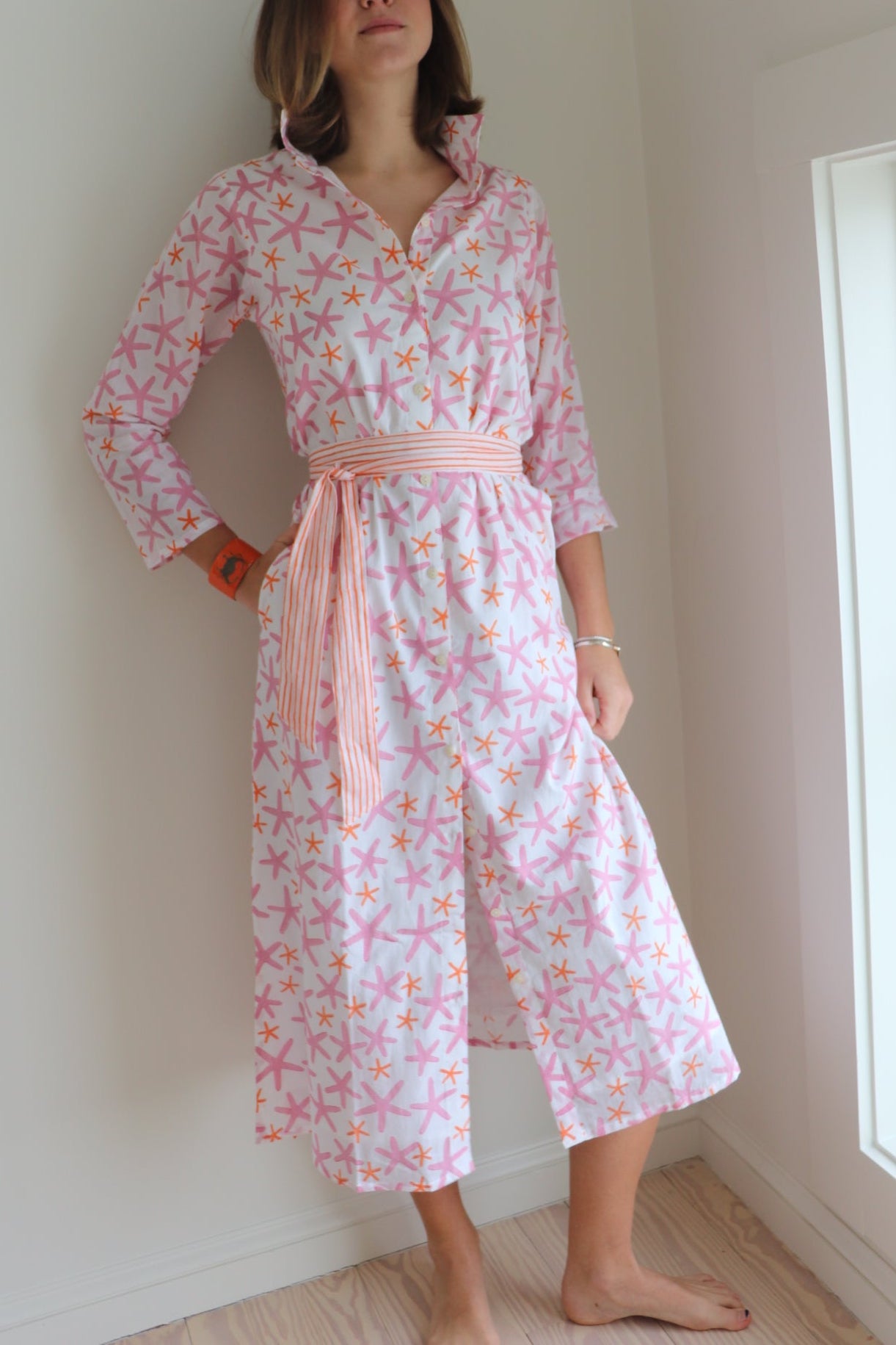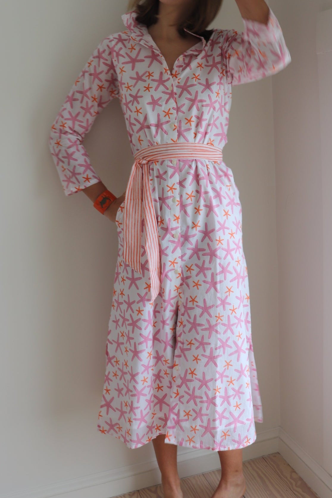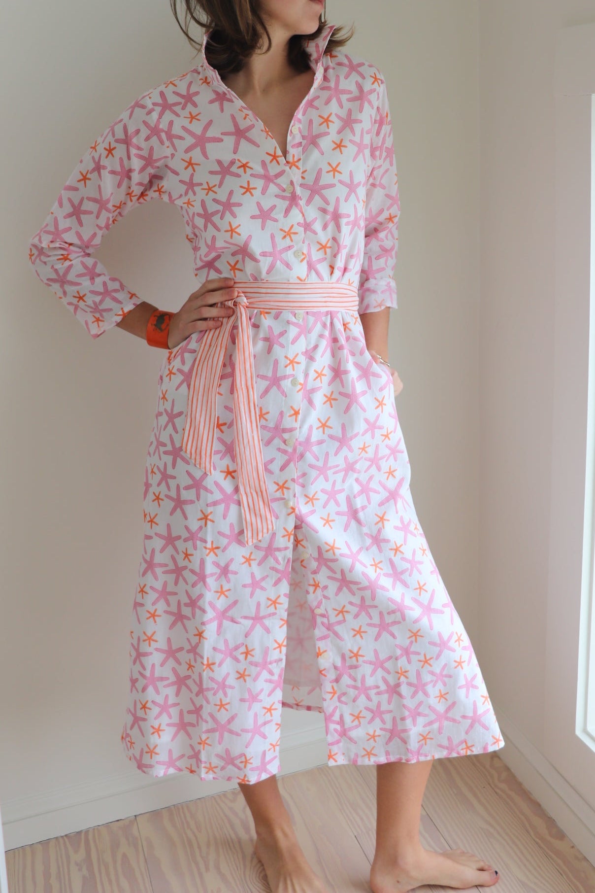 Pink Pineapple exclusive - 100% hand blocked cotton, fully lined, front button placket, slight A-line silhouette for an easy, carefree fit with a classic look. And of course with easy side seam pockets and matching sash - Weather your looking to cover up at the beach or dress it up for lunch at the club and of course 4th of July this dress is a MUST