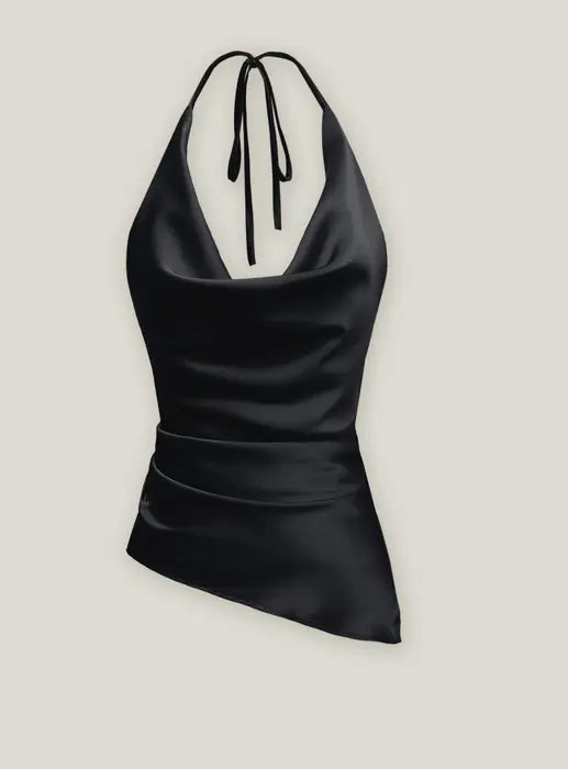 Designed for a relaxed yet elegant fit, this halter top is crafted from luxurious rayon satin fabrication! Featuring a draped neckline, an adjustable tie, and a low cut back with asymmetrical hem for an elevated, feminine style.