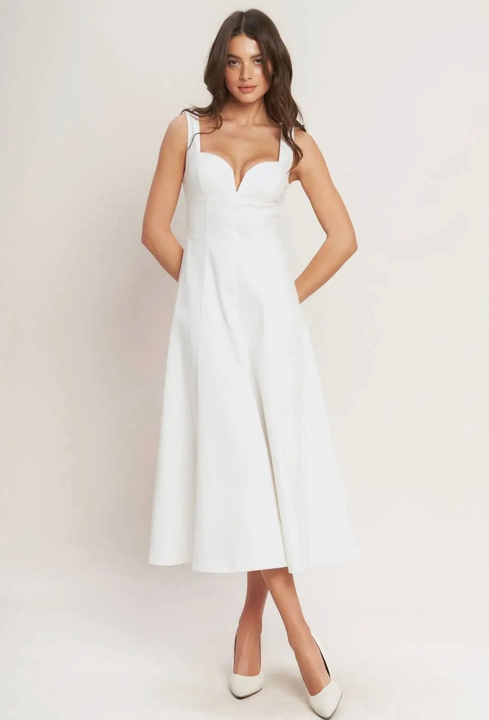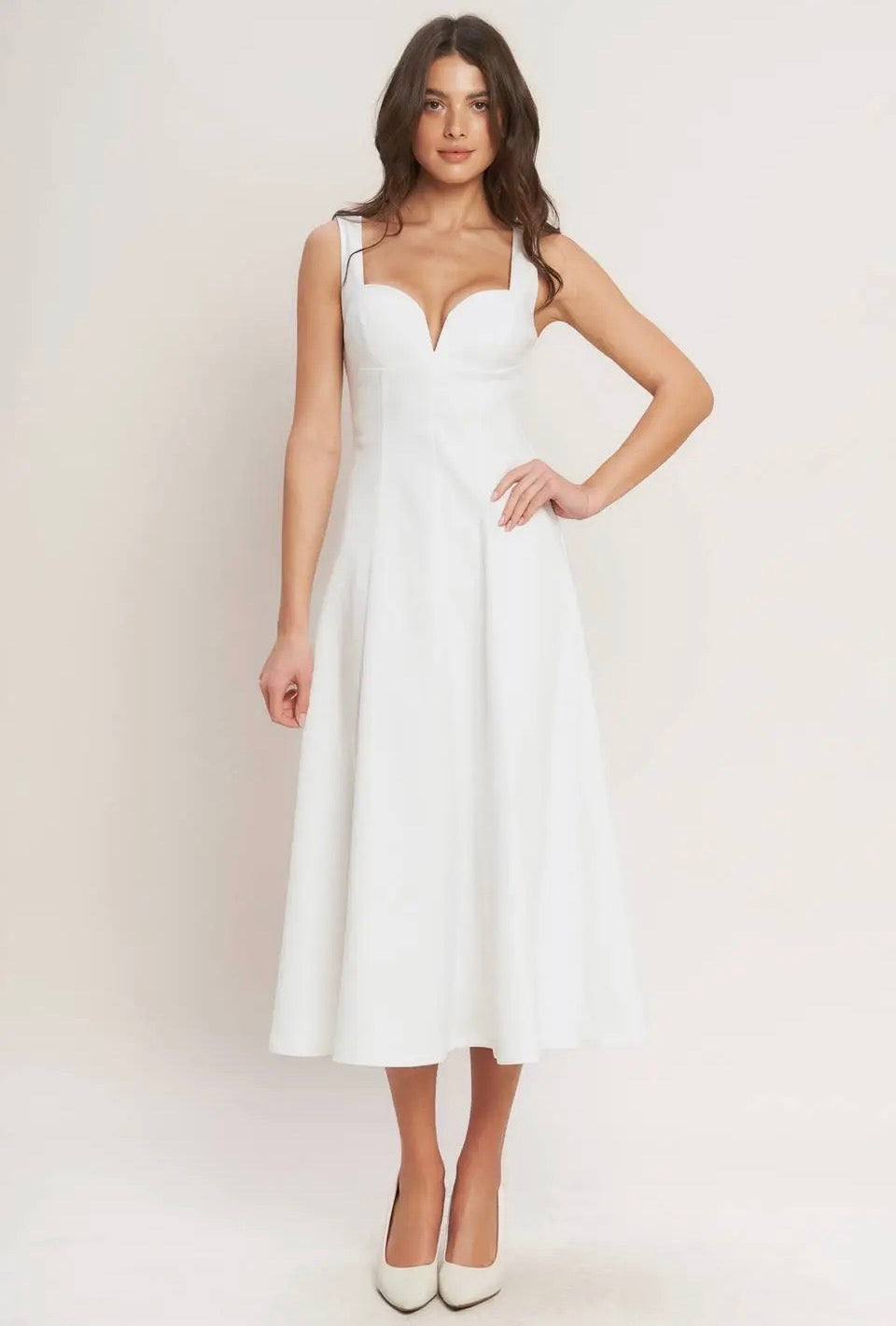 A fresh, feminine midi dress that feels effortlessly polished. The BALANCED PROPORTION WOVEN MIDI DRESS brings soft structure with a silhouette that flatters from every angle — a sweetheart neckline, a graceful circle skirt, and a clean, minimal finish. It’s the kind of piece that moves beautifully and makes you feel instantly put‑together for any occasion.