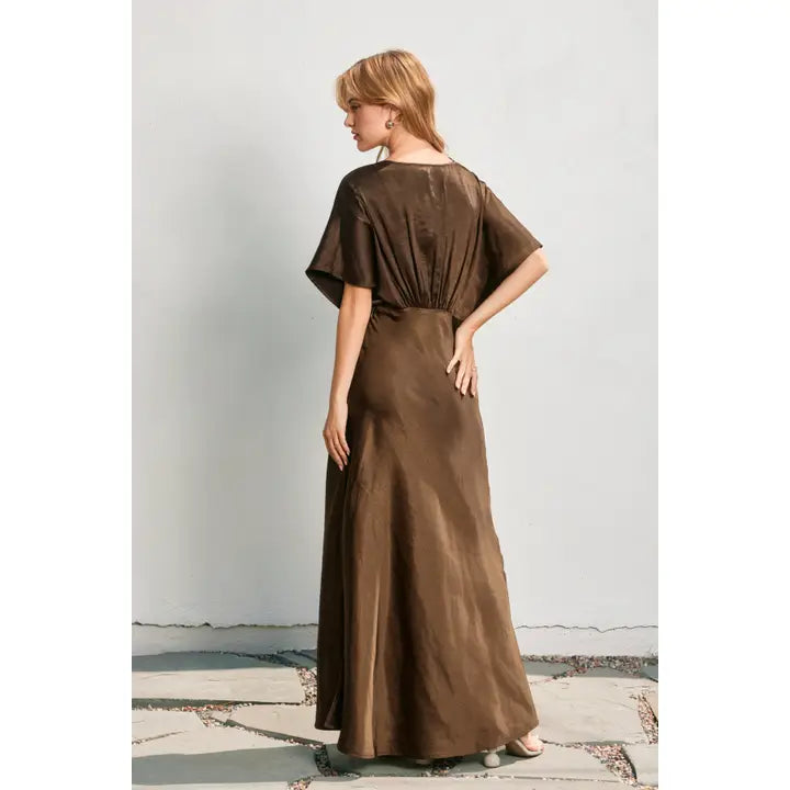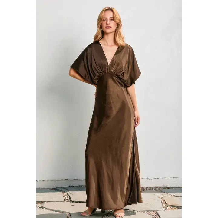Beatrice Bat Wing Sleeve Satin Dress in Chocolate