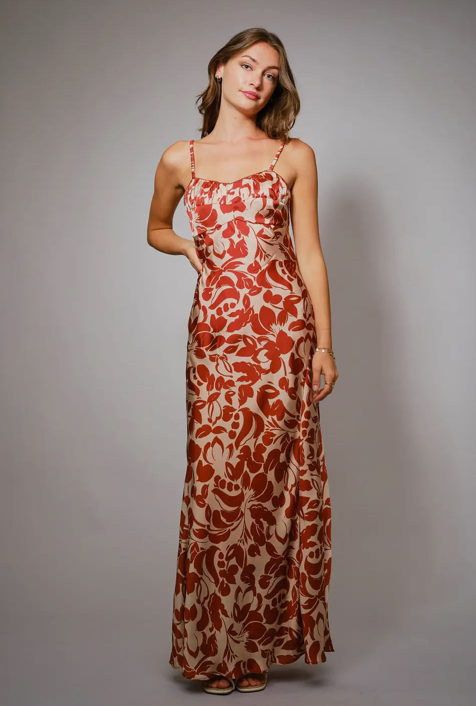 Captivate the night in this bicolor Maxi Dress. Featuring an adjustable strap princess neckline, and alluring front pinched detailing, this dress blends elegance with a touch of daring sophistication.