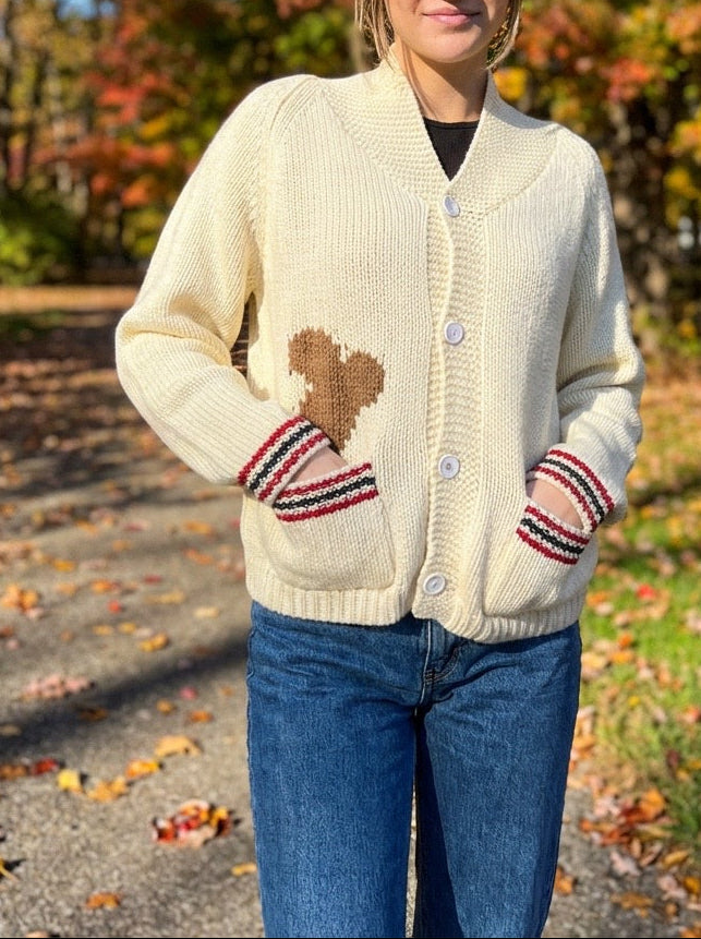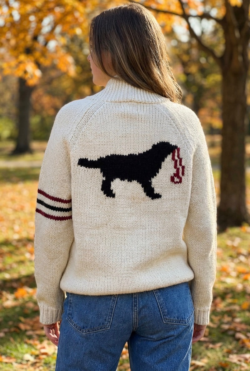 Elevate your casual wardrobe with this Black Dog varsity-inspired cardigan, knit for exceptional warmth and texture. Featuring a relaxed fit perfect for layering, while thoughtful design details—a charming dog motif adorning the back and bone embellishment on the front pocket. Ideal for those who appreciate quality knitwear with character, and love their animals! The substantial knit weight ensures lasting durability and comfort through multiple seasons.