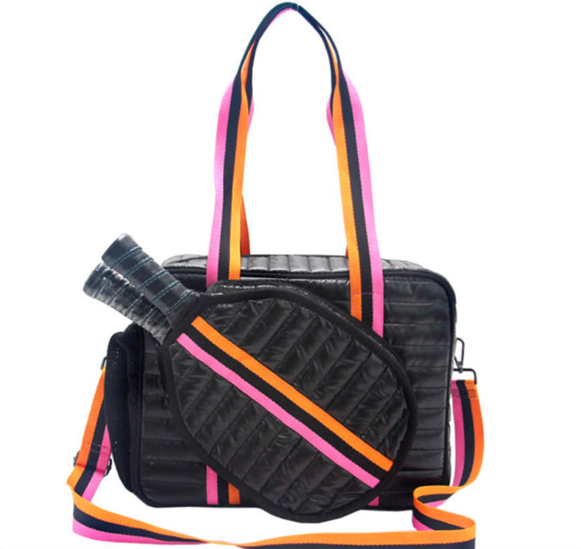 Features: Tote style, shiny quilted fabrication, detachable racket bag, back slip pocket with magnetic closure, front slip pocket, interior pockets including 2 side accessory pockets, side zipper pocket, 2 side clips , zipper closure, canvas bottom, luxe trim detachable and adjustable crossbody straps.