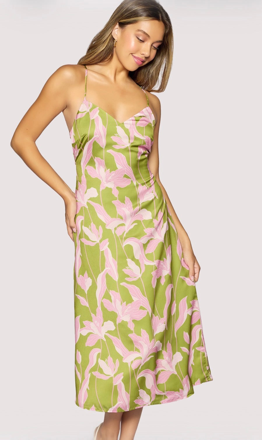 Soft, romantic, and effortlessly chic — the Blush Bloom Satin Midi Dress is made to turn heads. Designed in a silky satin finish with a fresh green base and delicate pink floral print, this dress brings a modern yet feminine feel to any occasion. The flattering bias-cut silhouette drapes beautifully along the body, while the delicate spaghetti straps and subtle V-neckline add an elegant touch.