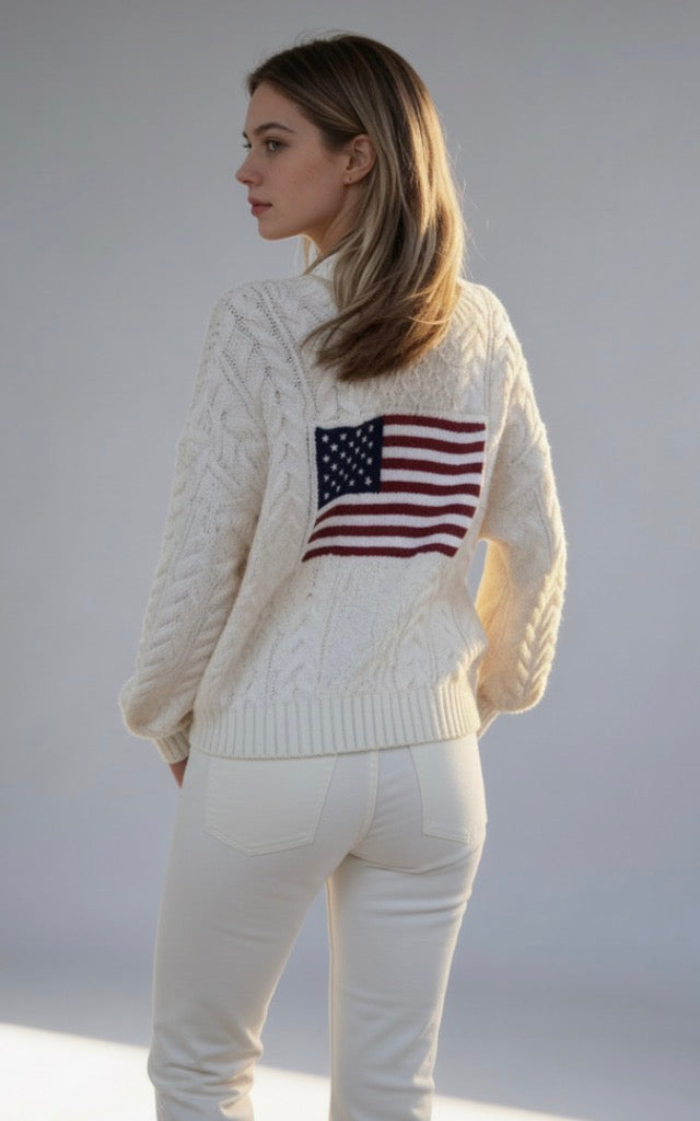American style, classic, traditional and chic. The quality of this head turning, whip stitched sweater features a beautiful flag motif with individually embroidered stars on the back. This is a Sweater you will treasure for years to come! Made of 100% fine Cotton with attention to every detail.