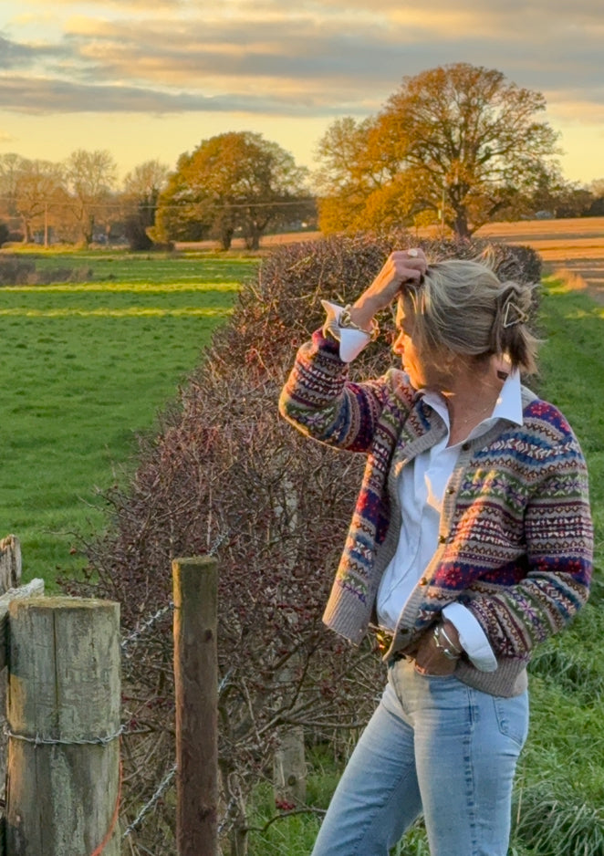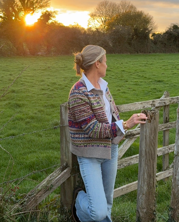 This cozy knit cardigan features a geometric Fair Isle-style pattern in a thousand colours exuding stunning timeless charm.