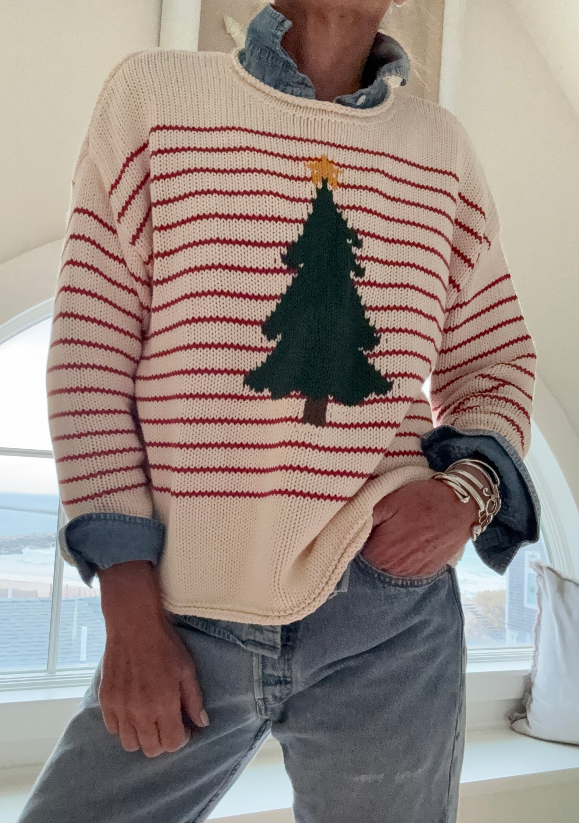 Our NEWEST addition to the Pink Pineapple Christmas Collection - Our favorite Chloe Stripe Rollneck now in ivory/red stripes and an adorable Christmas Tree - we LOVE this COMBO for the holiday season!