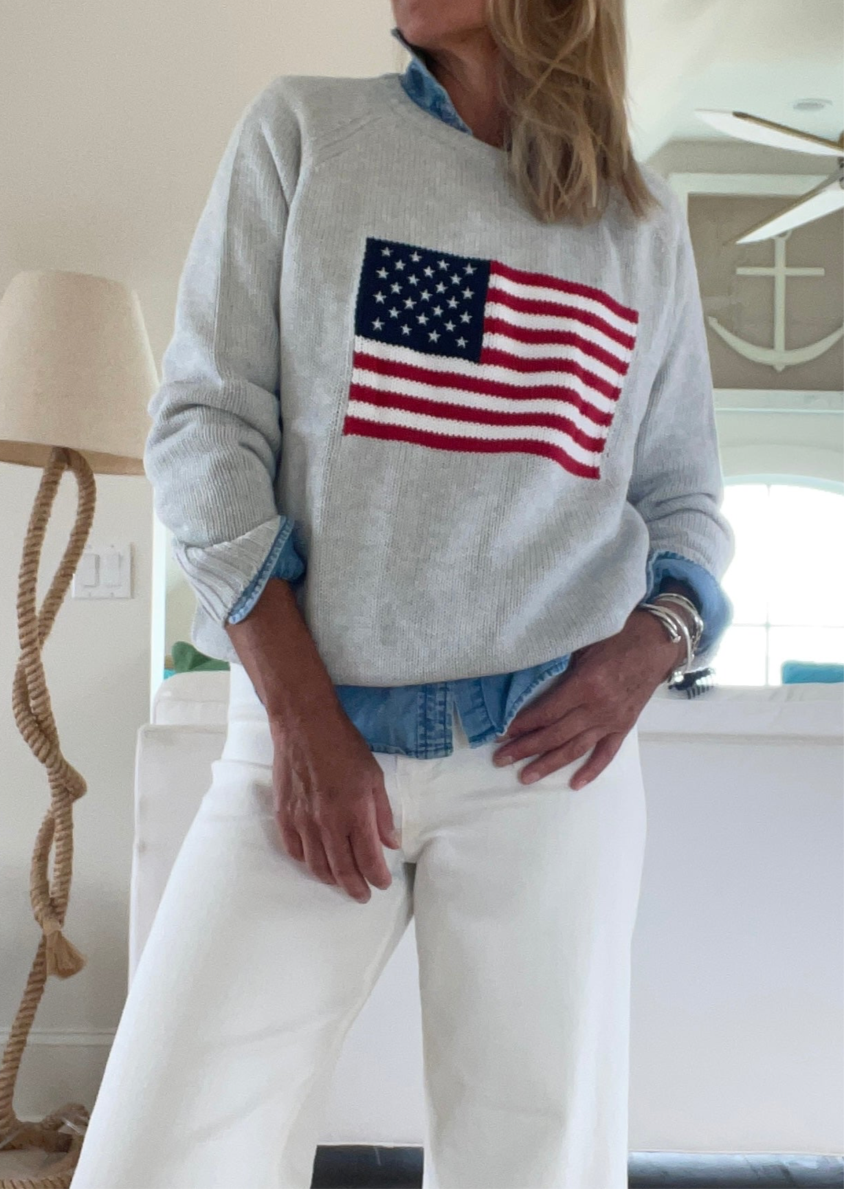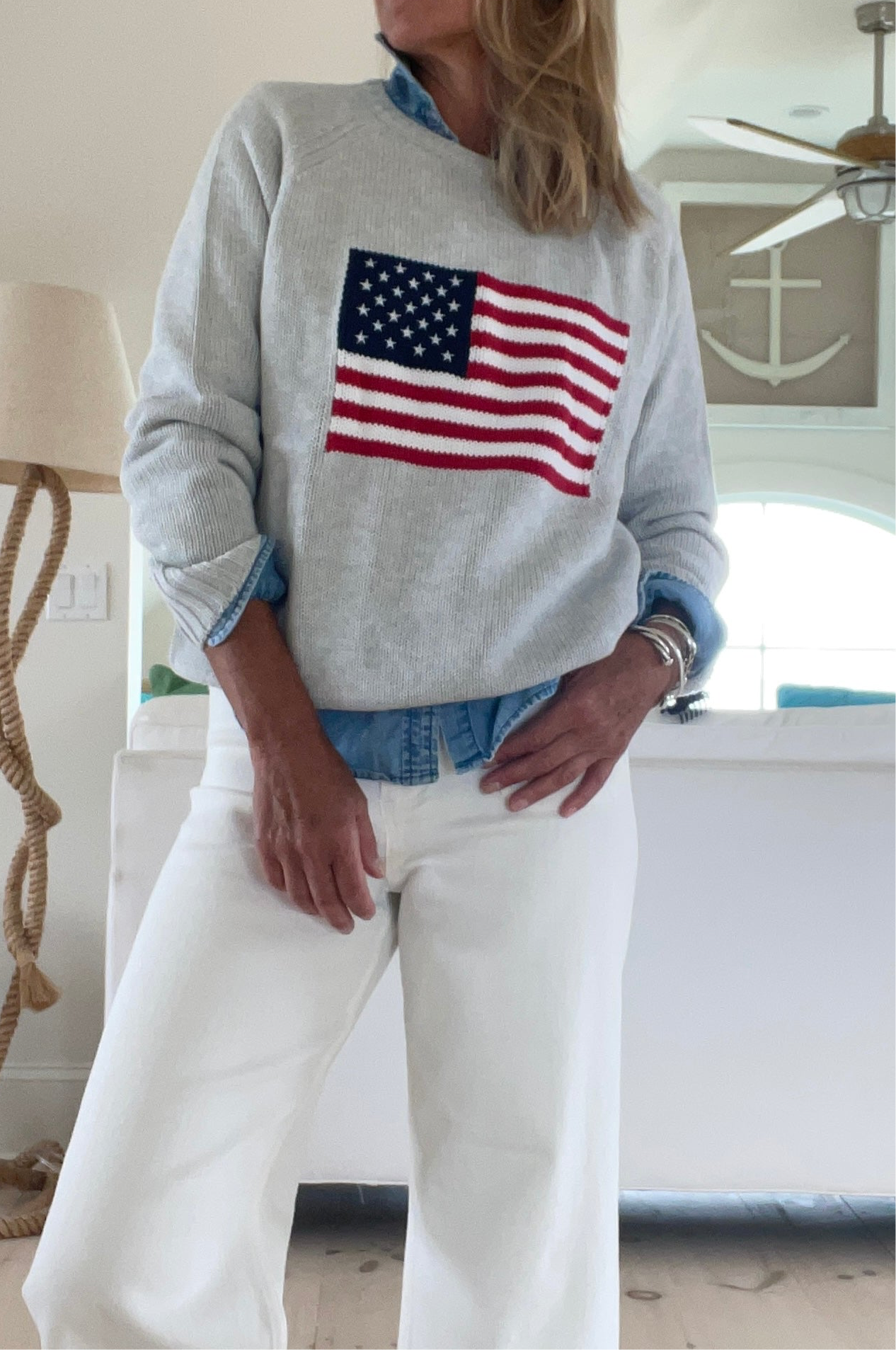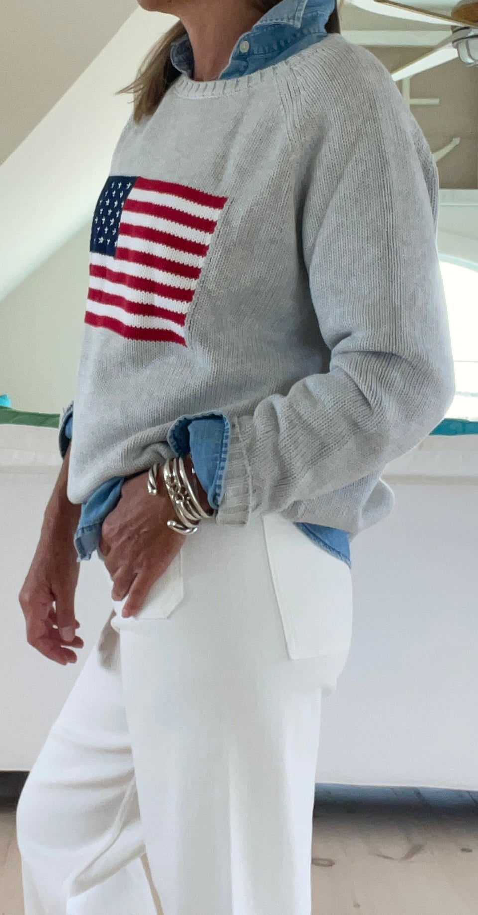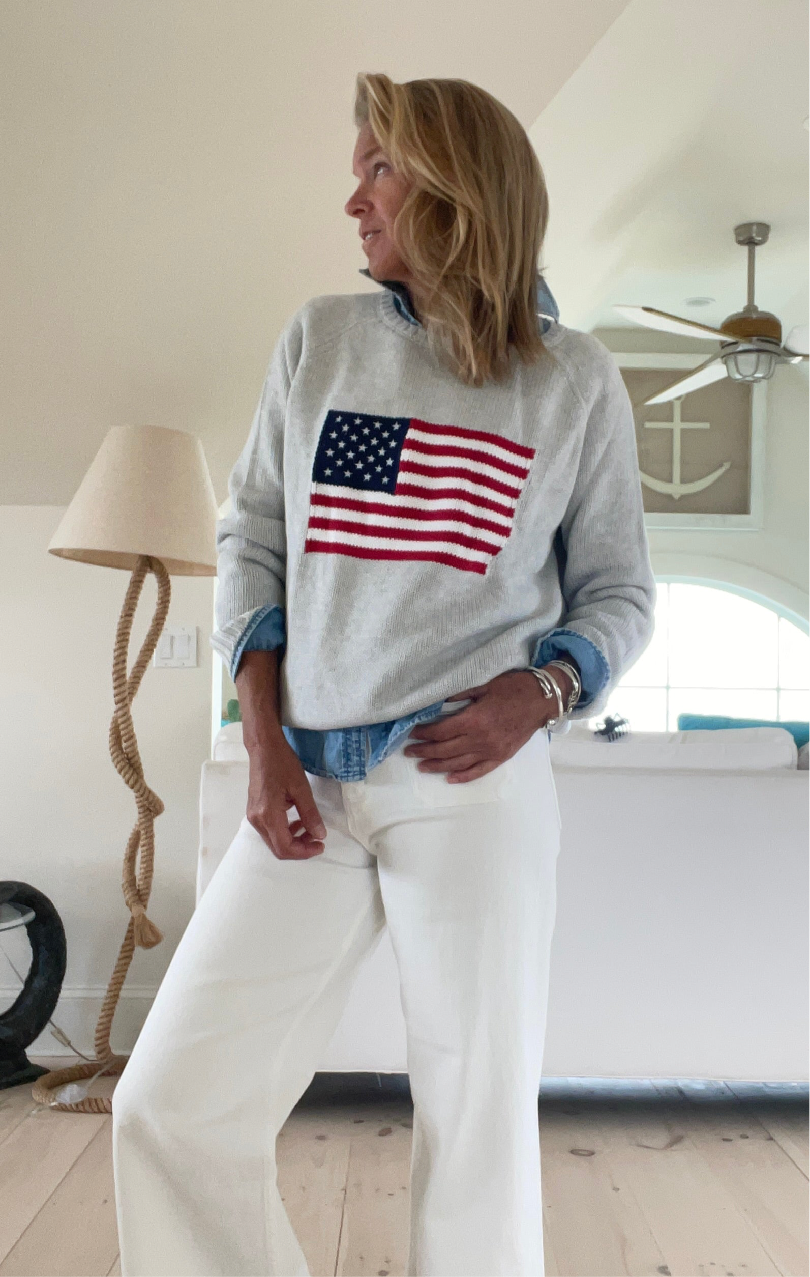 Taking everything we love about Vintage Flag Sweaters to create this New, 100% cotton Chunky, but loose, and breezy flag sweater. Complete with ribbed cuff collar and hem, and finely detailed with embroidered stars. The ideal comfy sweater for all year round.