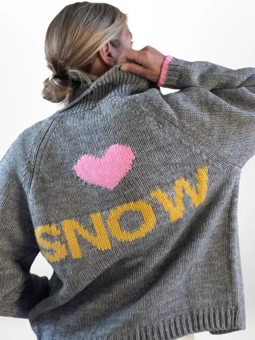 For chilly fall and winter days, reach for this charming cardigan - with its bold ❤️ SNOW motif, it's the perfect layer to suit any season. This classic varsity duffle cardigan is so cozy you’ll find it hard to take off!