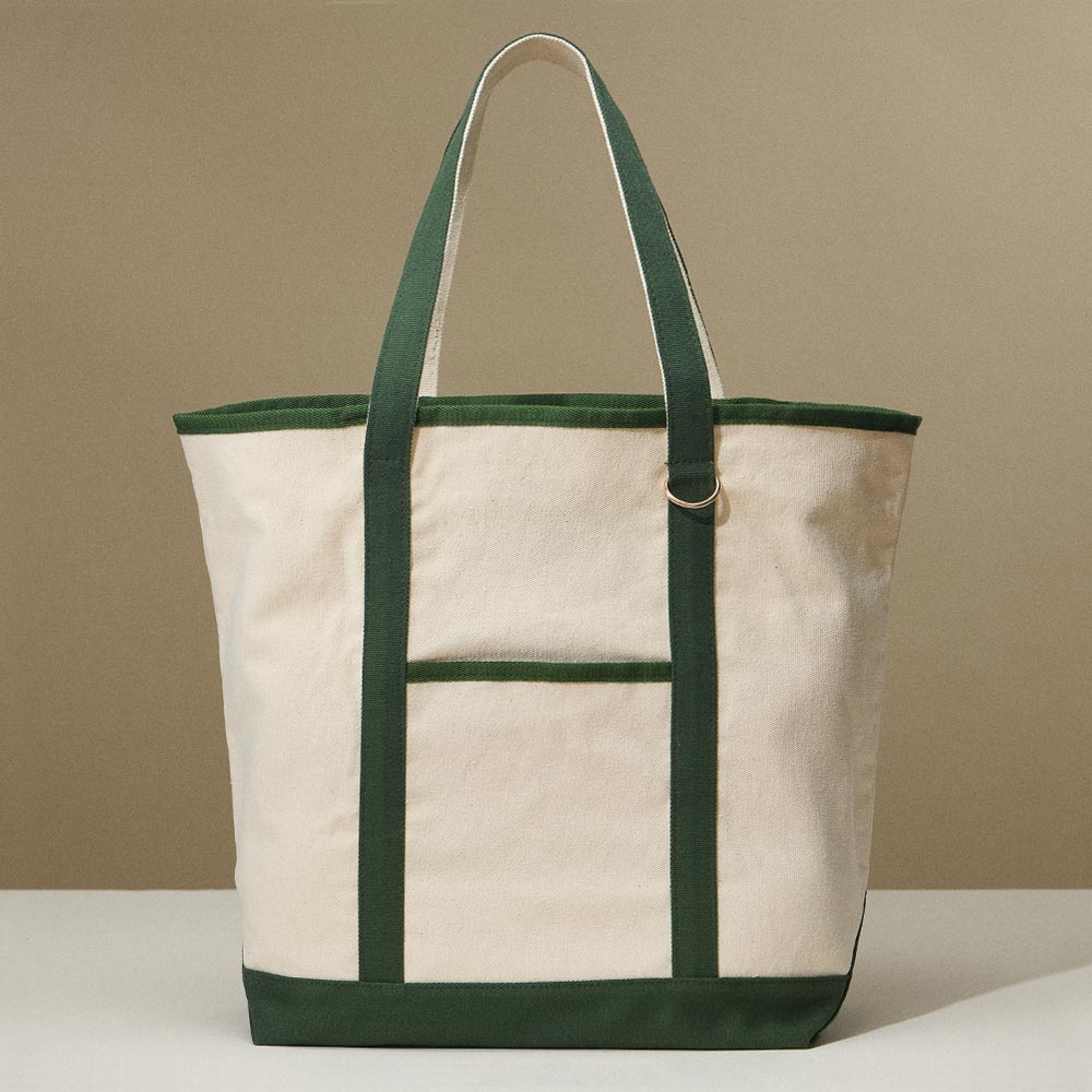 Size : 15" X 19" • Material : 100% Cotton • Perfect for carrying groceries, books, laptop, or beach essentials • Front Slip Pocket, One Metal Ring • Reinforced straps and bottom : Sturdy and built to carry heavy loads