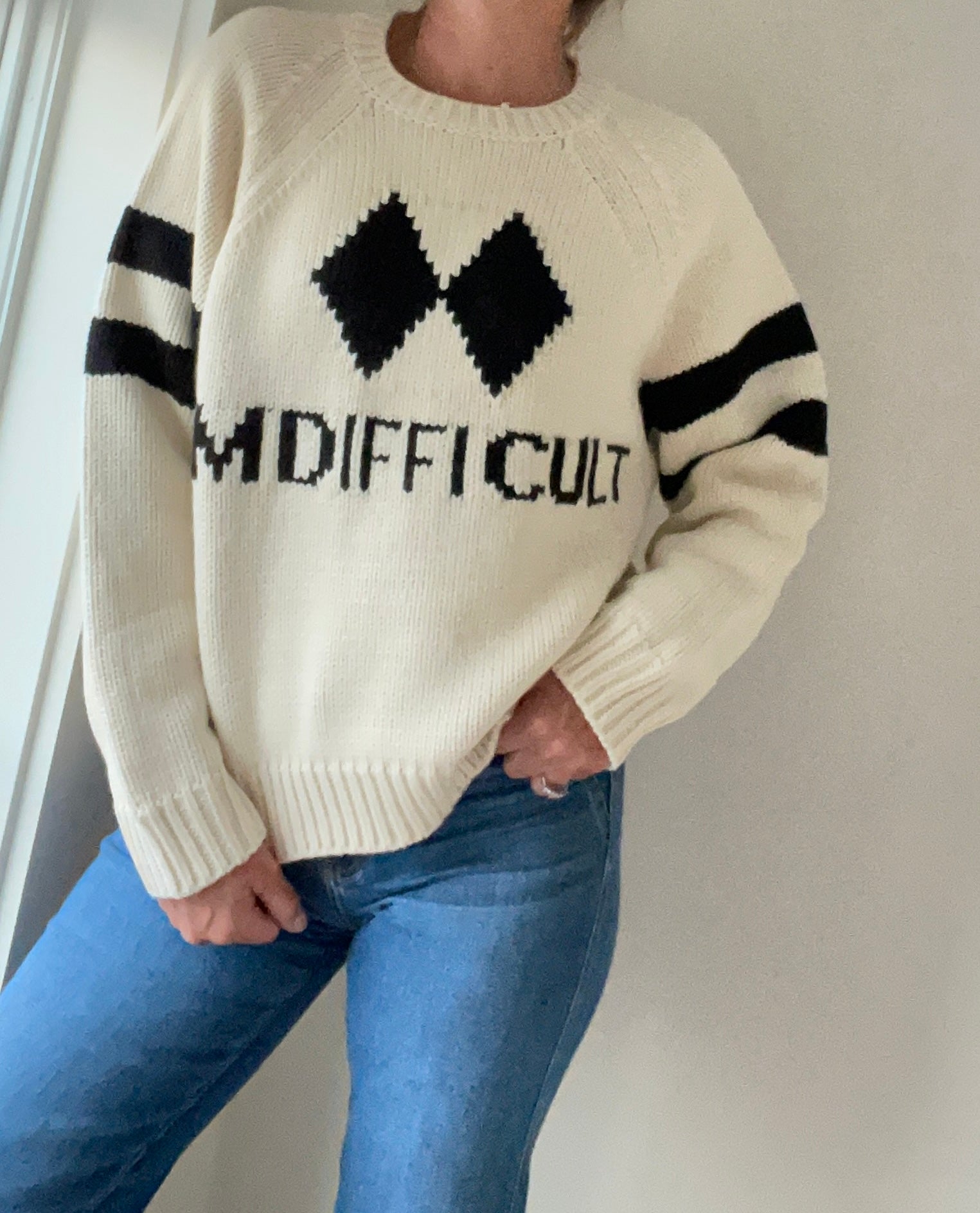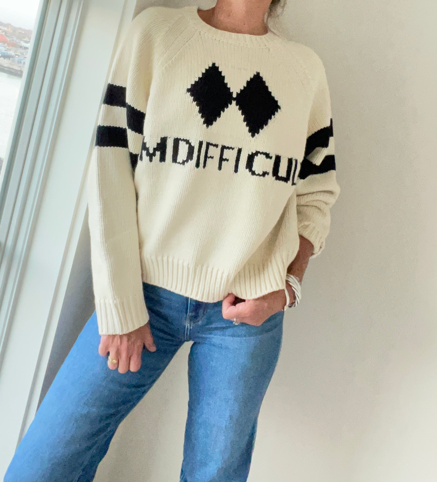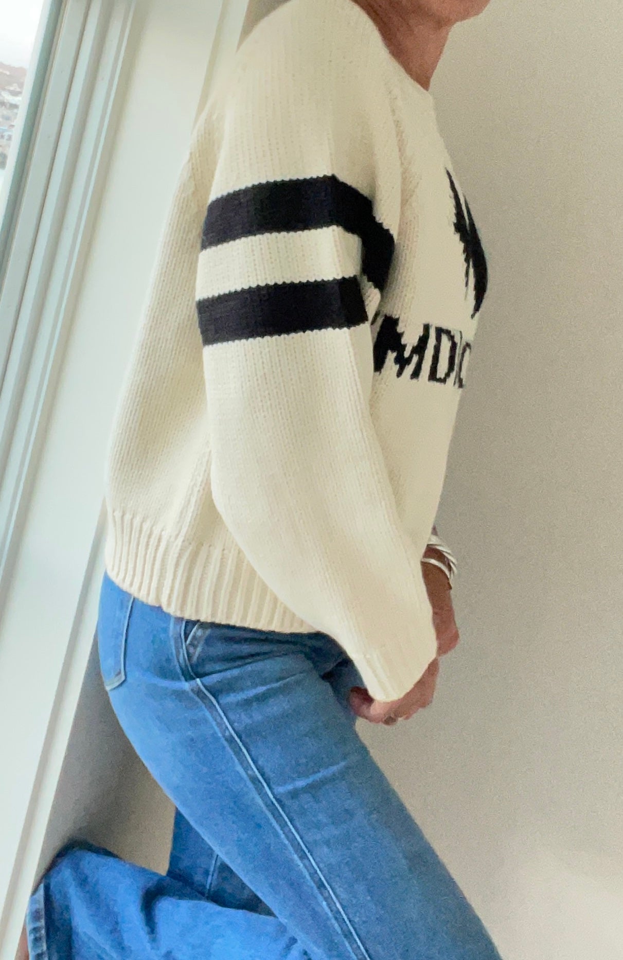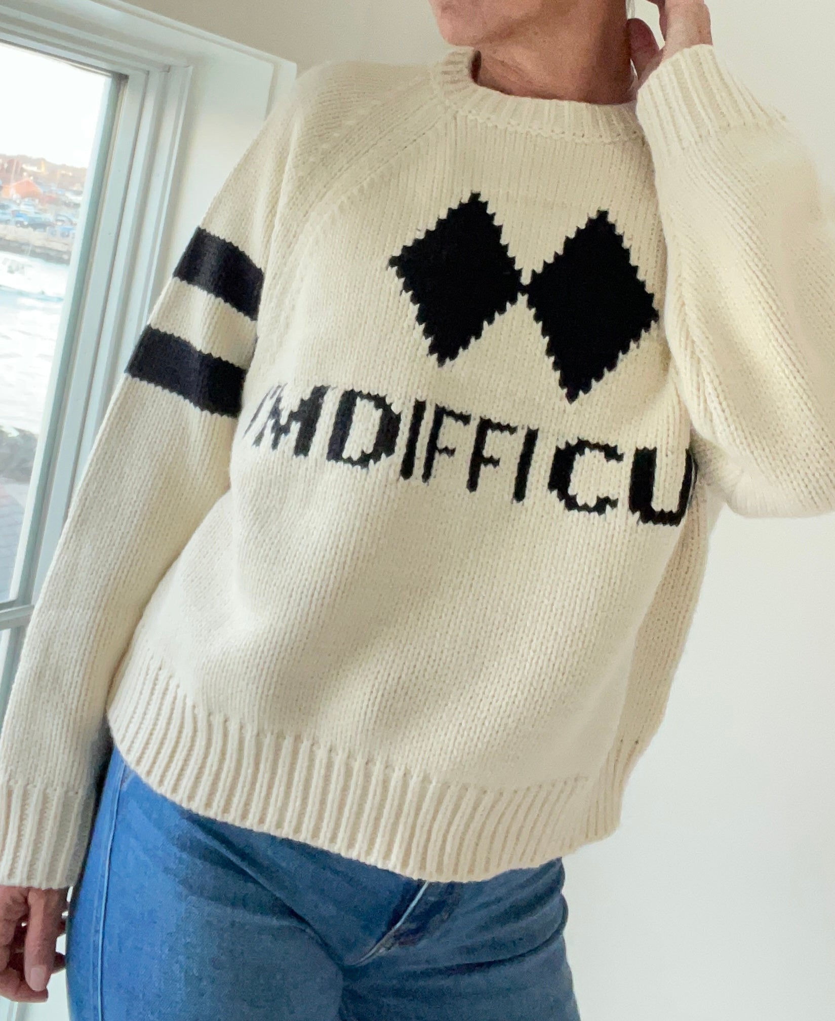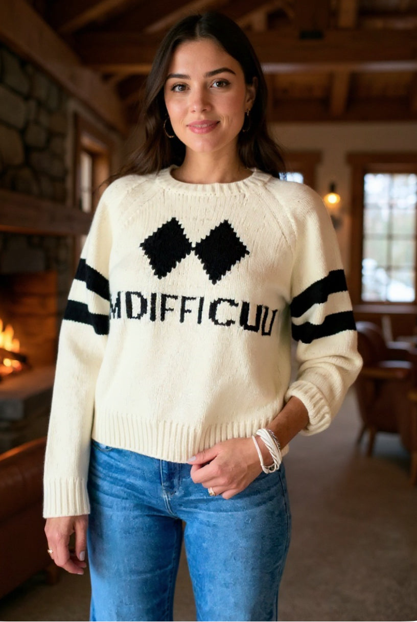 Classic raglan acrylic crew with SKI knit on the Front. This carefully crafted chunky sweater is knit from a thick 100% acrylic for easy care and YEARS of wear. For sure to be a GOGO to staple all winter long.