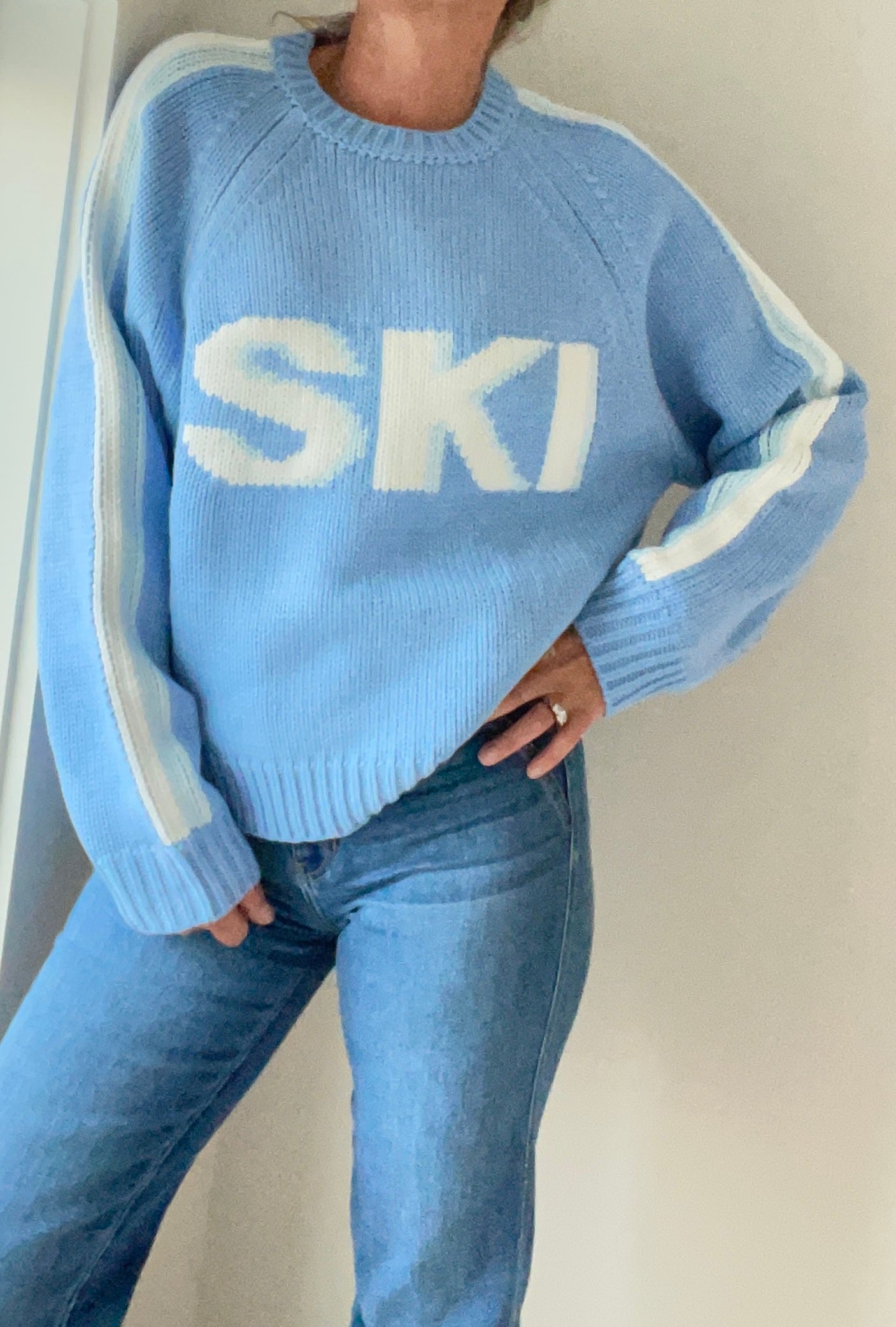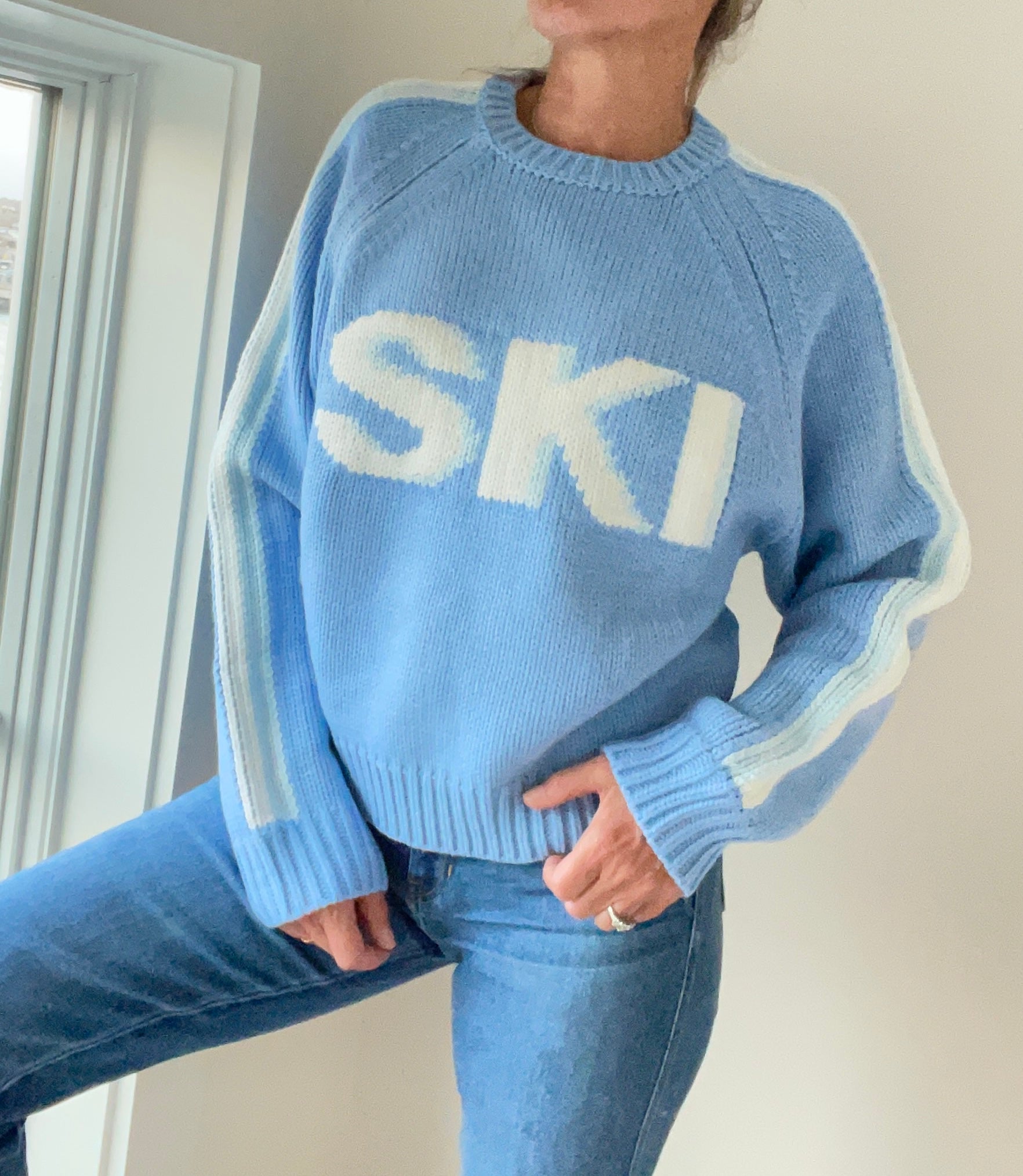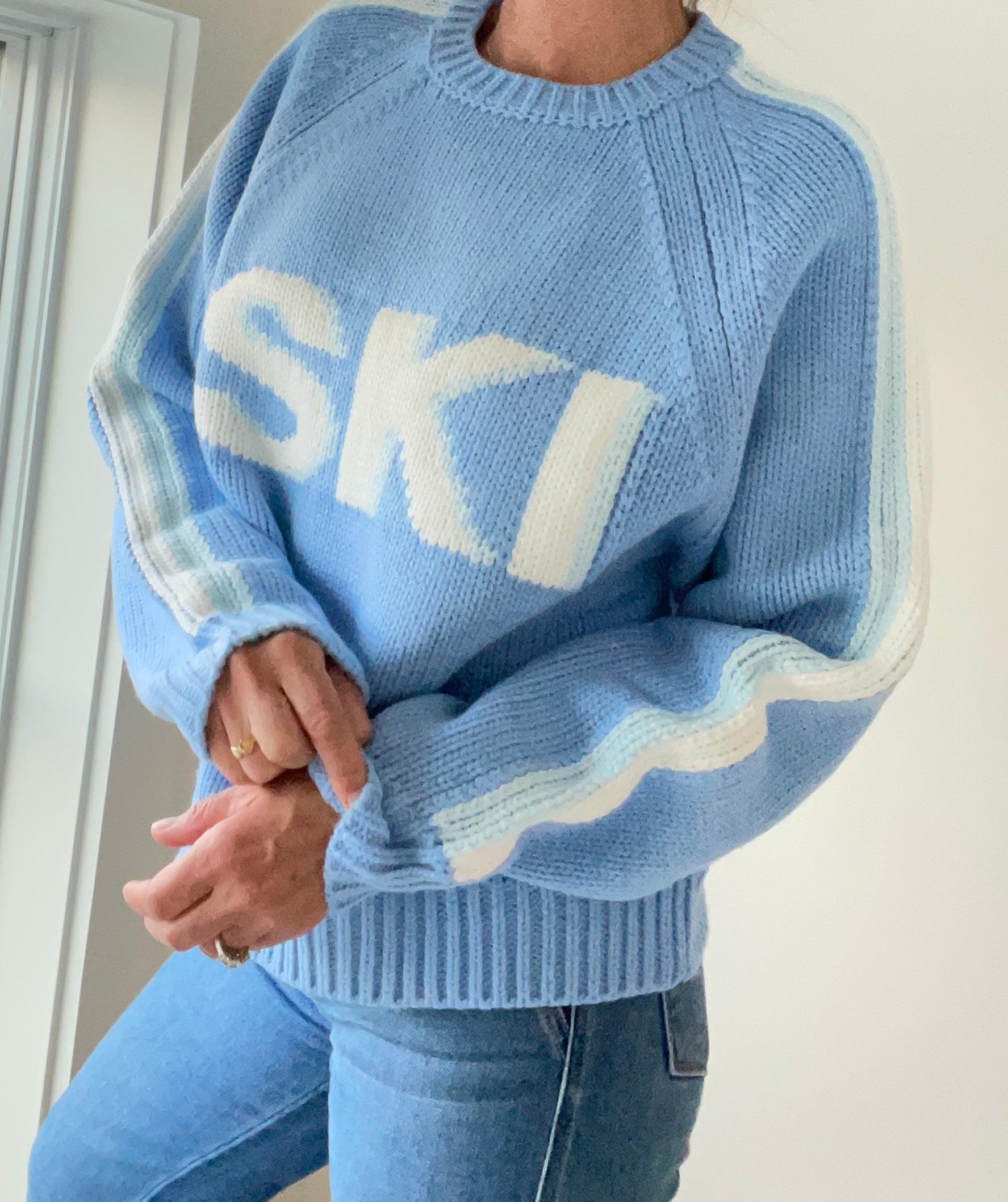Classic raglan acrylic crew with SKI knit on the Front. This carefully crafted chunky sweater is knit from a thick 100% acrylic for easy care and YEARS of wear. For sure to be a GOGO to staple all winter long.