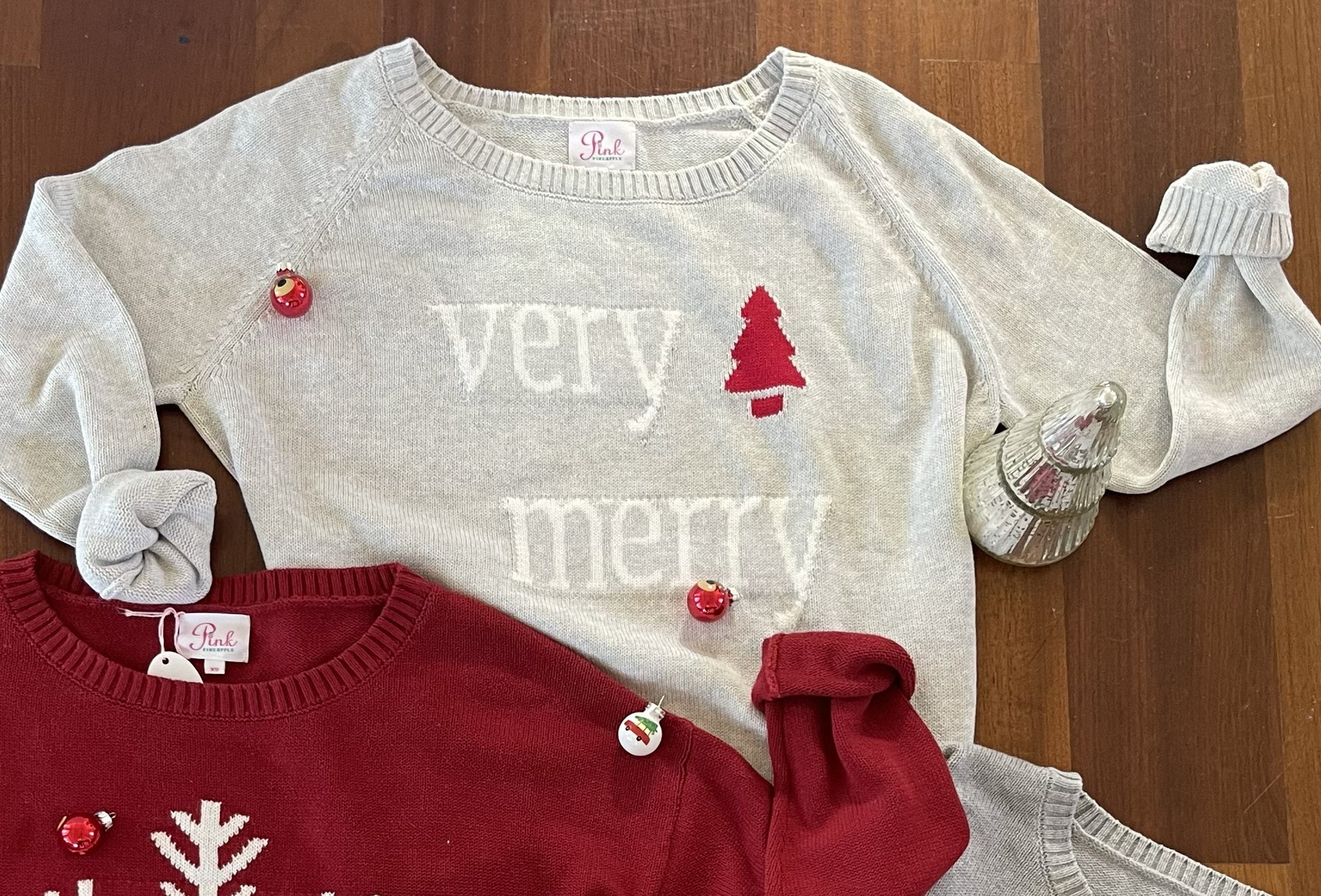 Our Classic Very Merry Cotton Sweater is 100% cotton and 100% cozy for the winter season! "Very Merry" in white lettering on our gray classic style sweater now features Christmas tree elbow patches for added Christmas cheer!