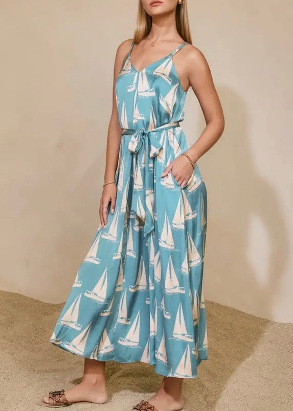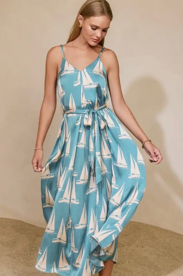 Effortless elegance meets coastal charm in this printed midi dress. The square neckline and adjustable spaghetti shoulder ties create a relaxed, flattering silhouette, while contrast trim detailing adds visual interest. A practical side hidden zipper and graceful side slit make movement easy, whether you're heading to brunch or an evening out. Partially lined for comfort and coverage.