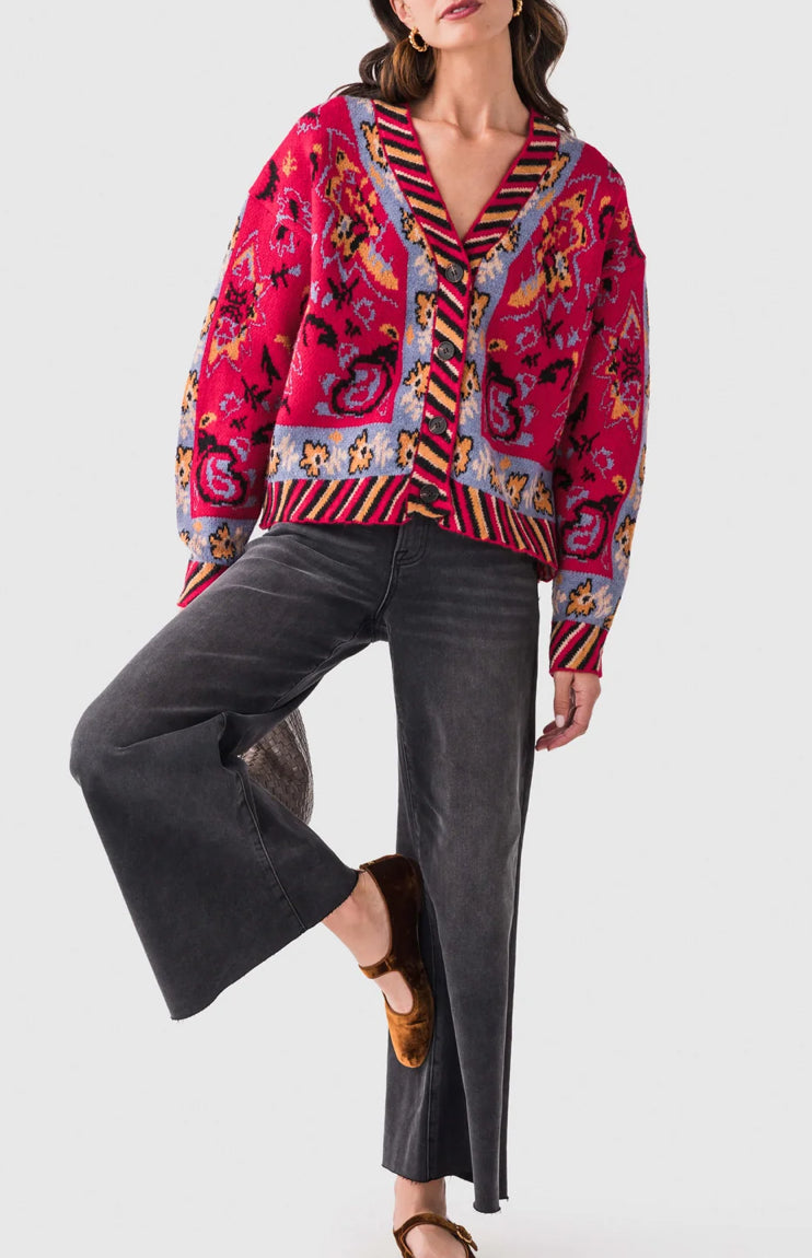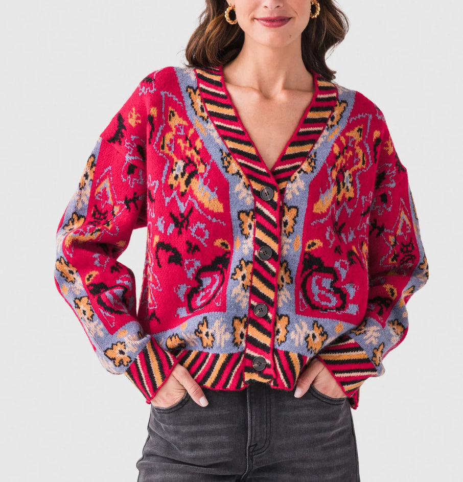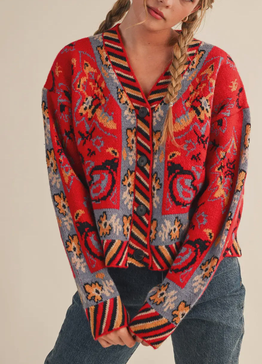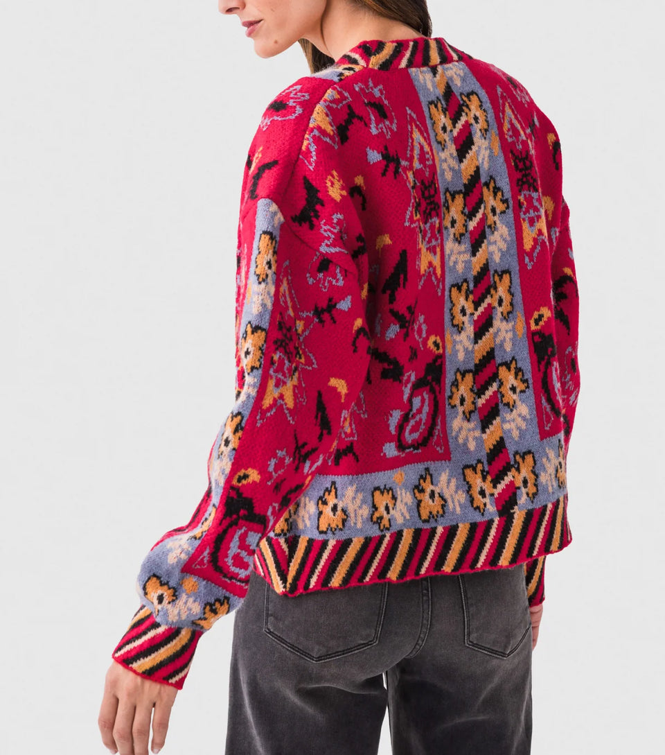 This unique knit boasts funky patterns and autumn colors, creating a vibrant and eye-catching aesthetic. Its relaxed fit drapes comfortably, while the contrast trim adds a refined touch. Perfect for layering or wearing alone, it injects personality into any outfit.