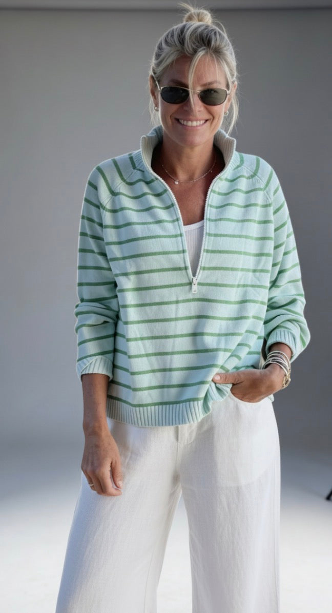 1/2 Zip Cotton Sweater Stripe Aqua/Green