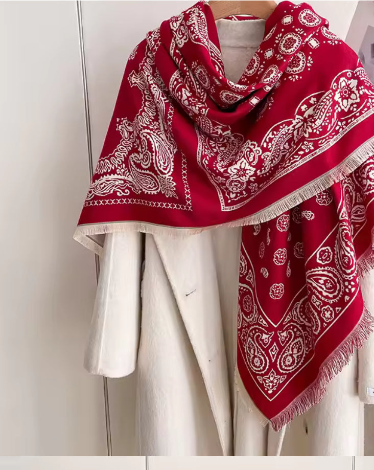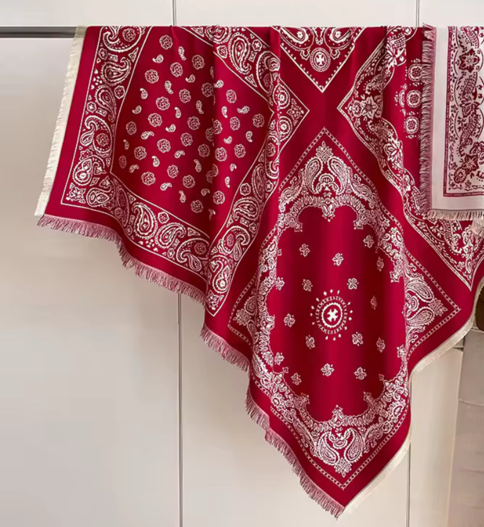 This bandana printed scarf drapes like a caress and sublimates the silhouette