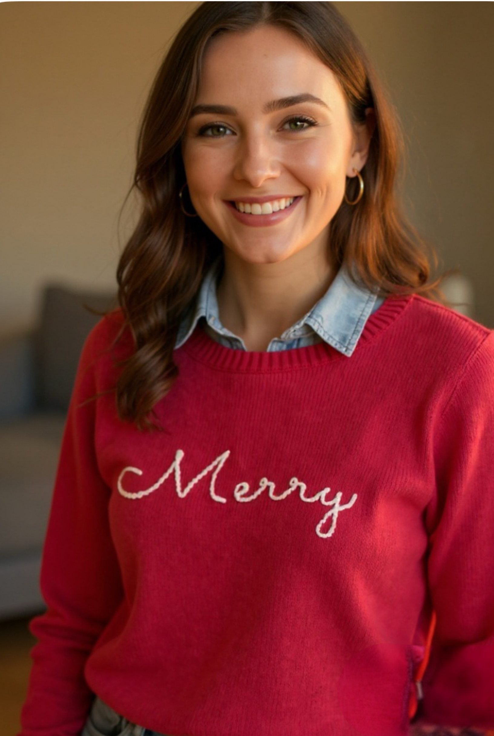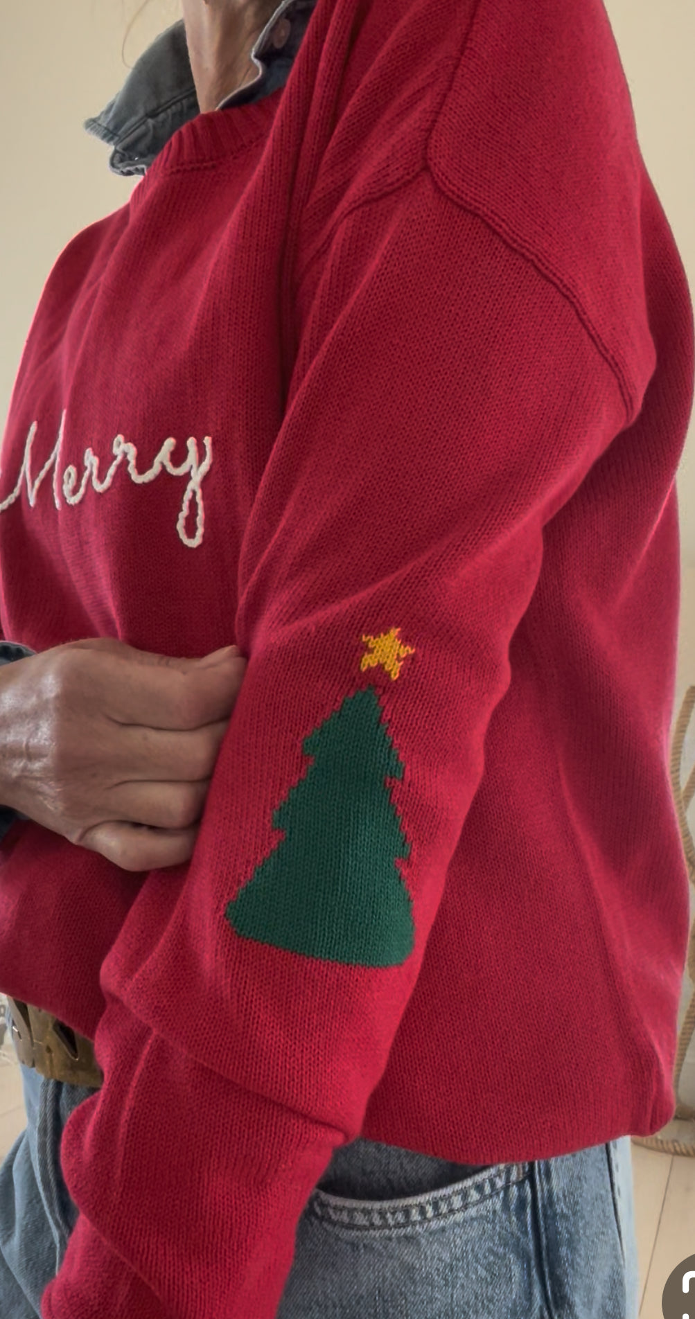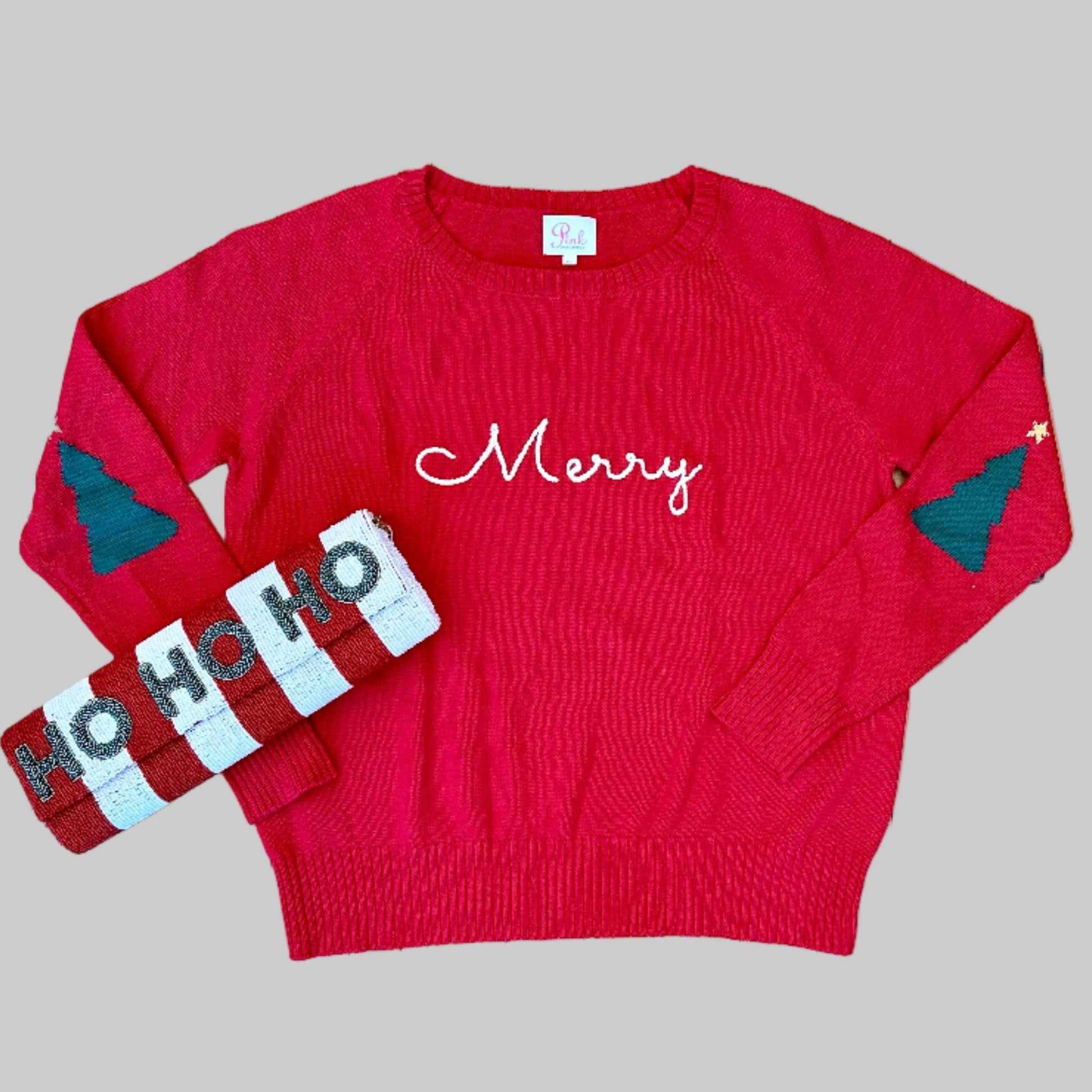 Our 100% cotton sweater is delicately embroidered with a crisp white MERRY on the front and accented with knit in Christmas trees on the elbows! A FAVORITE for the Holidays