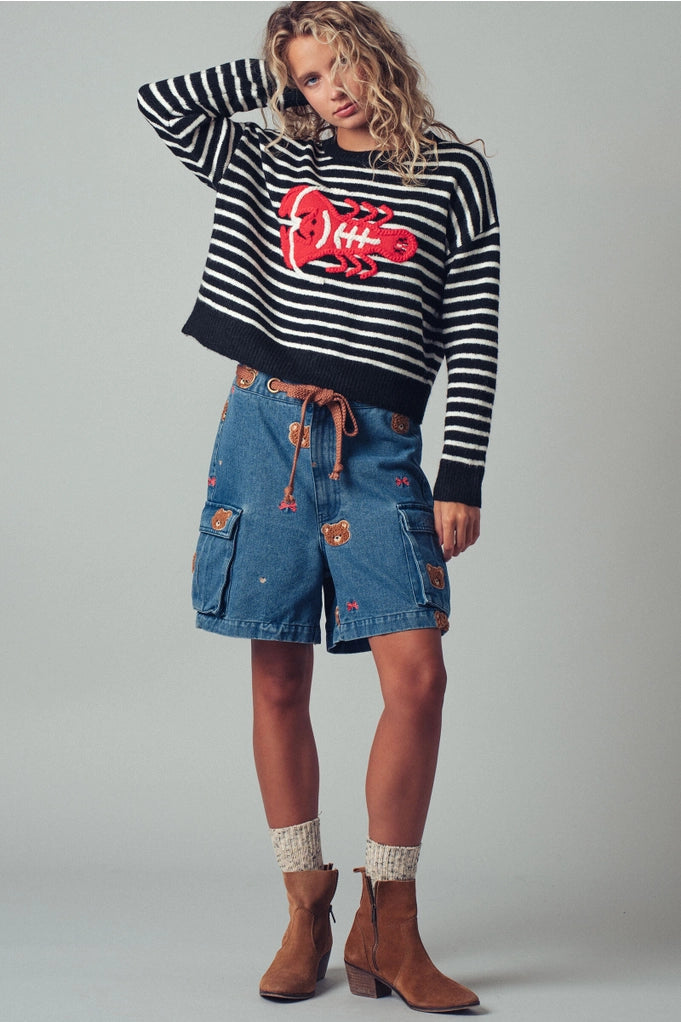 Embroidered Red Lobster Sweater In Ivory/Black Stripe