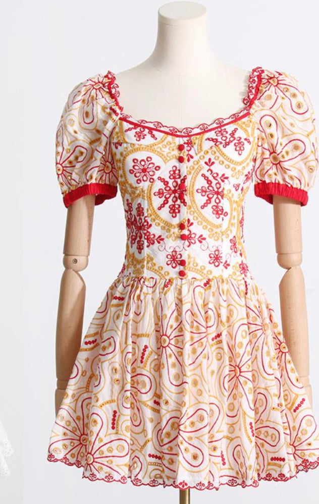 The corset bodice, the pretty balconette neckline and the puffed sleeves create the silhouette of our most romantic dress. Made of embroidered eyelet, this babydoll fits comfortably thanks to the shirred back, and can be styled to suit so many occasions taking you from lunch with the locals to dinner.