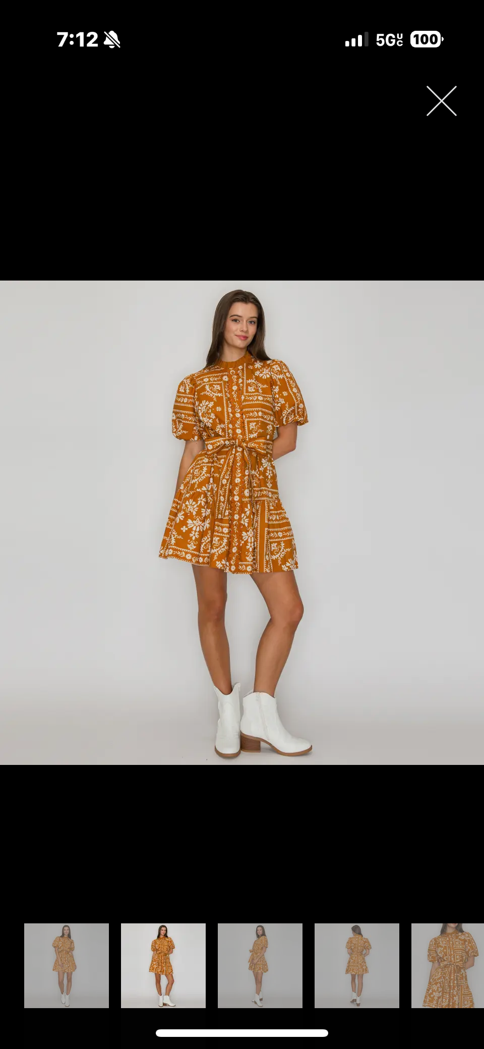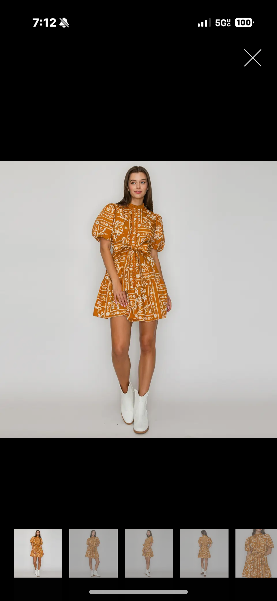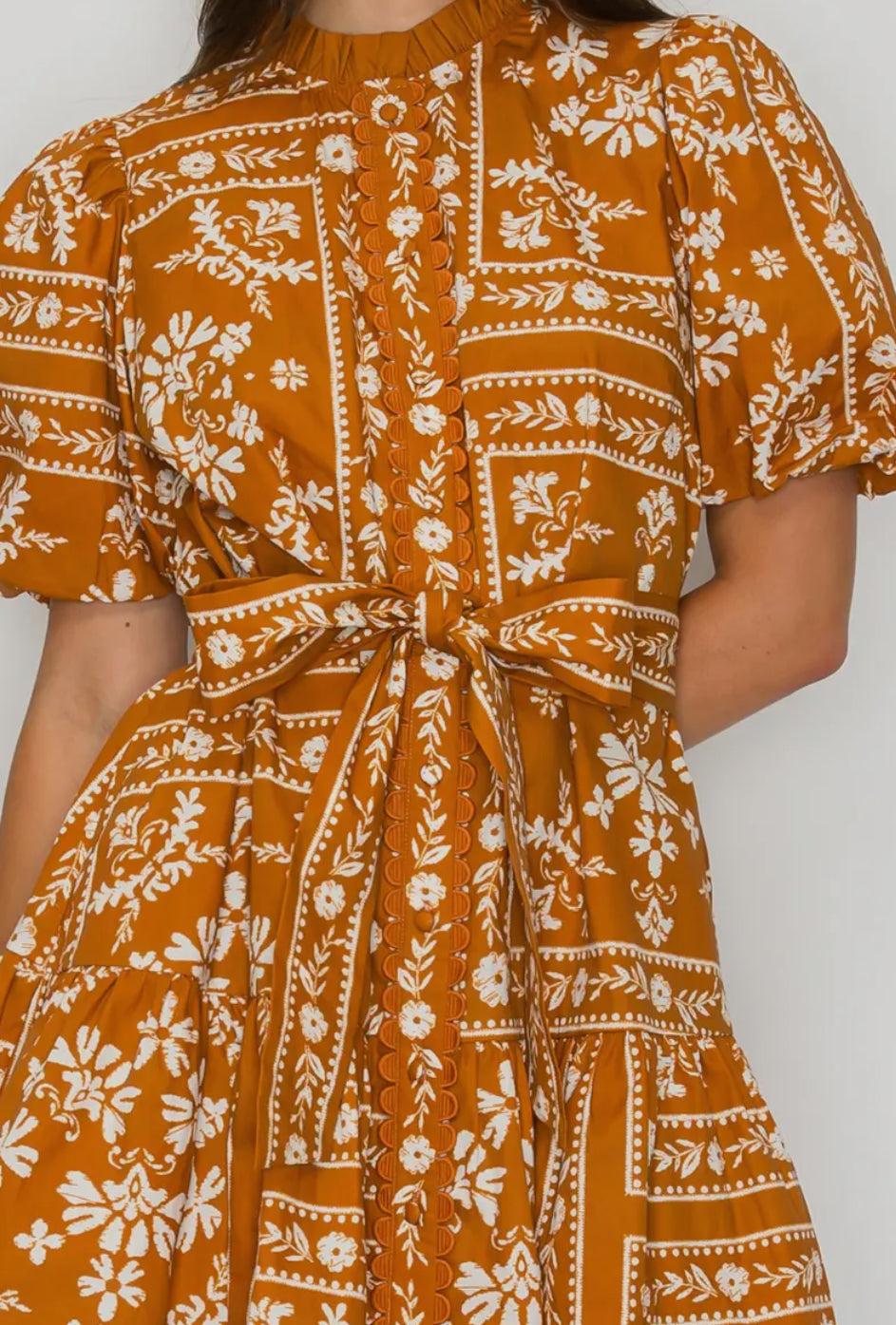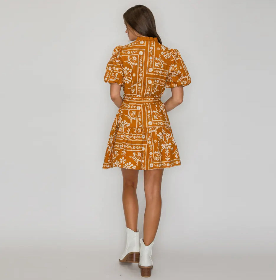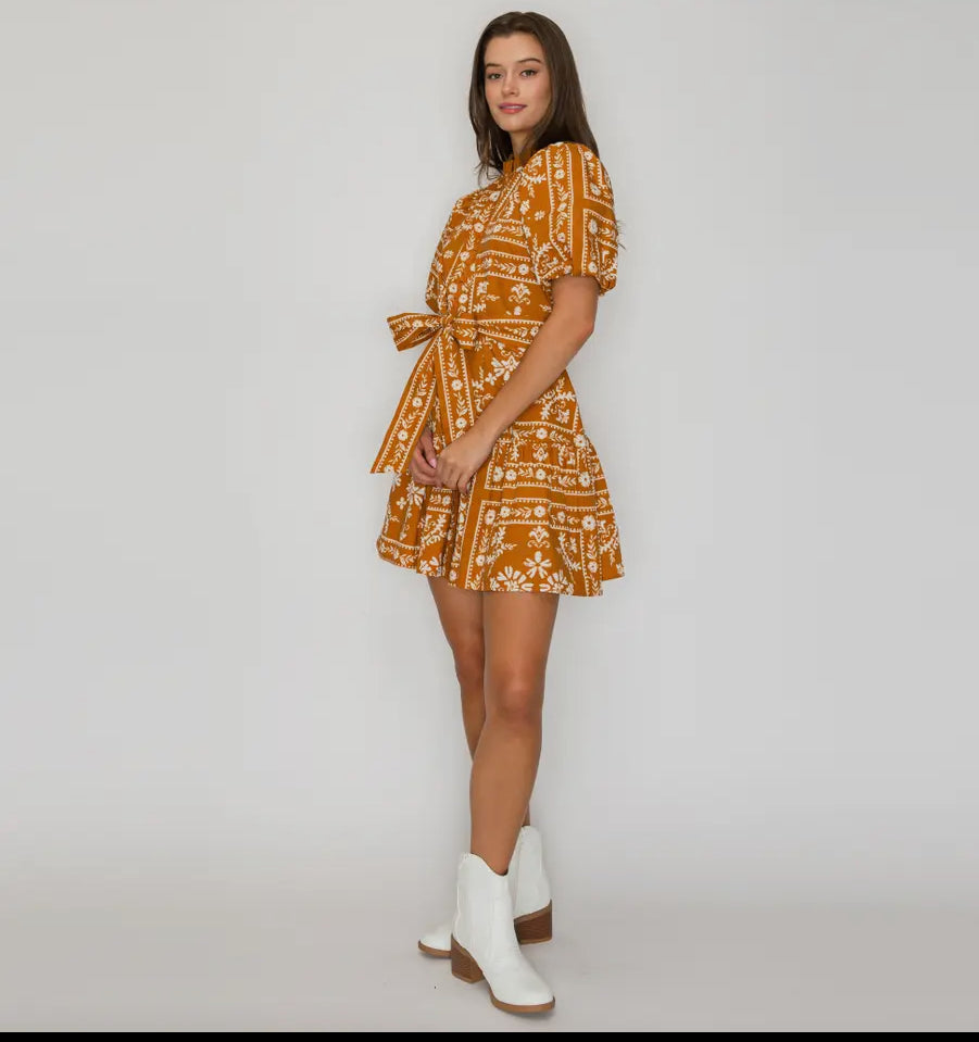 This dress captures the golden glow of fall. Featuring a rich burnt orange hue and soft white print, it’s finished with a feminine neckline and functional buttons for an effortless fit. Pair it with booties for football Saturdays or dinner on the patio. A fall must-have. Add to your cart today. Runs true to size.