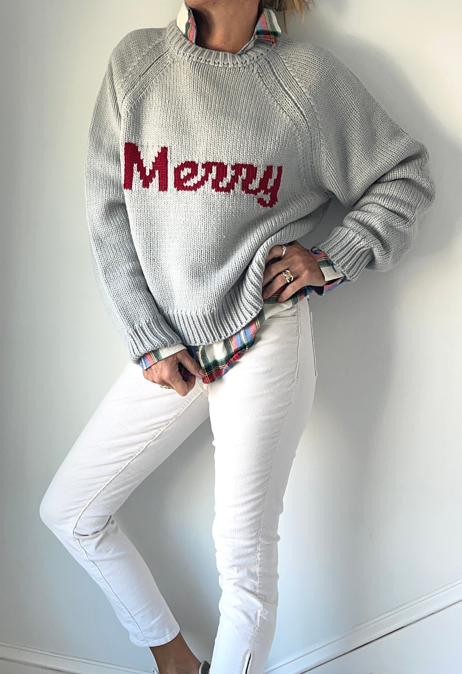 Classic raglan crew with MERRY script knit on the chest. This carefully crafted chunky sweater is knit from a thick 100% acrylic for easy care and YEARS of wear. For sure to be a GO TO staple all winter long.