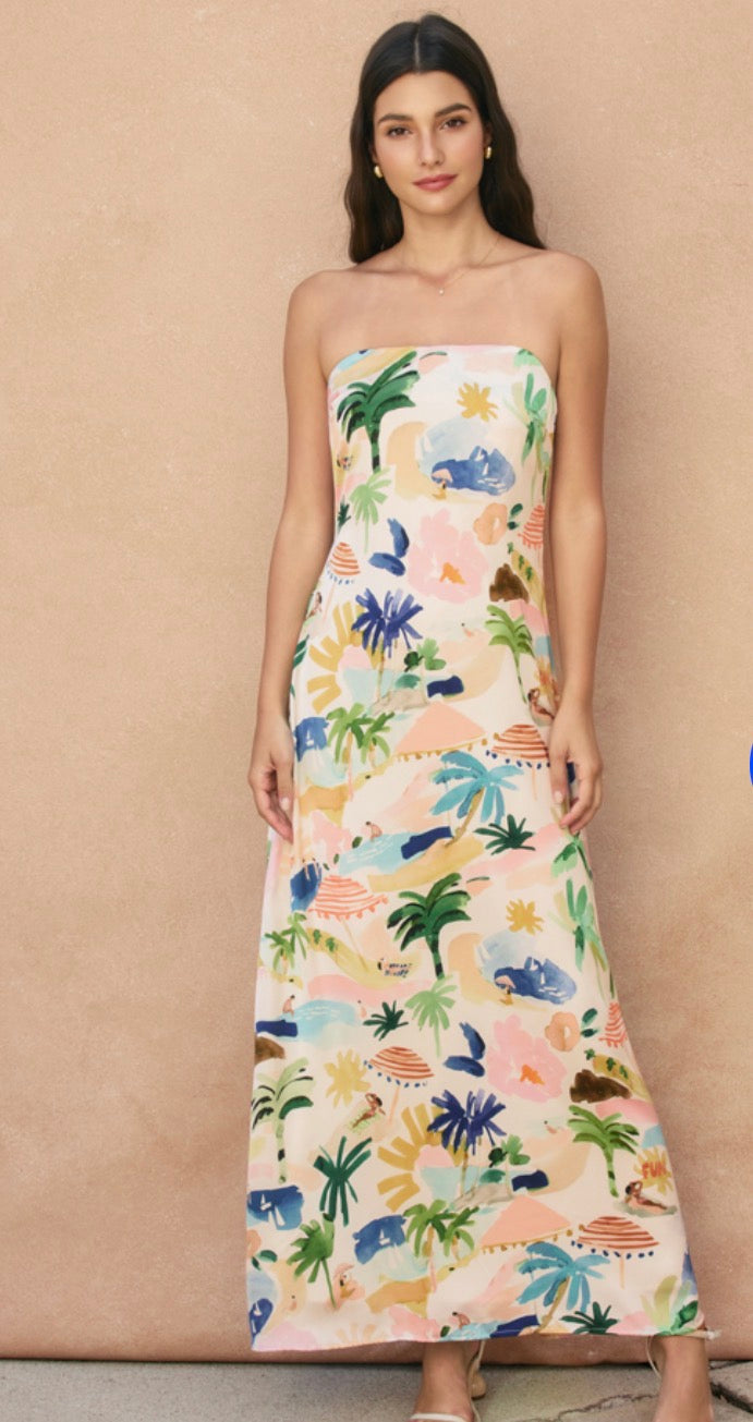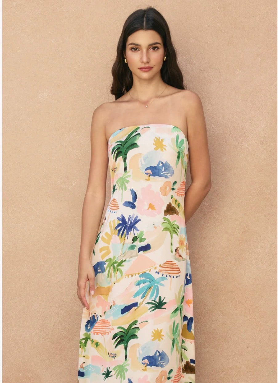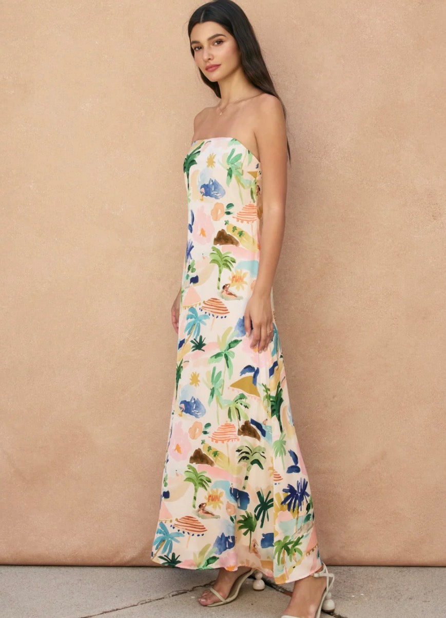 The Isla Perez Dress, crafted in l light weight fabrication in a bespoke coastal print, features a straight, strapless neckline with gel gripper , fitted bodice with hidden zipper in a maxi length.
