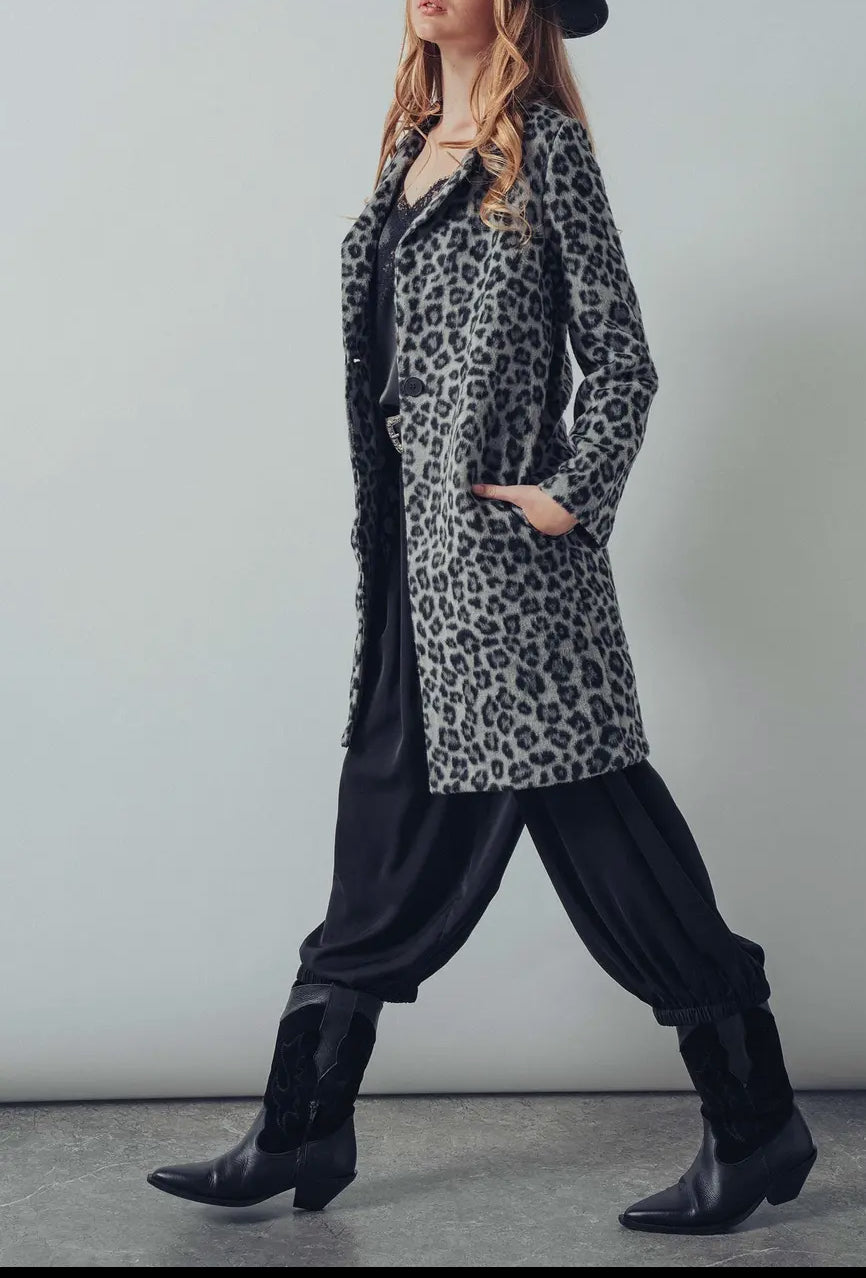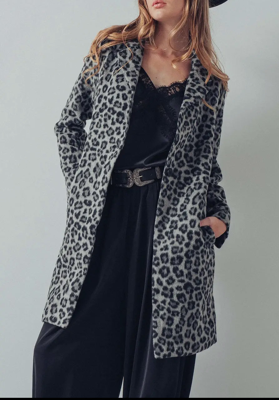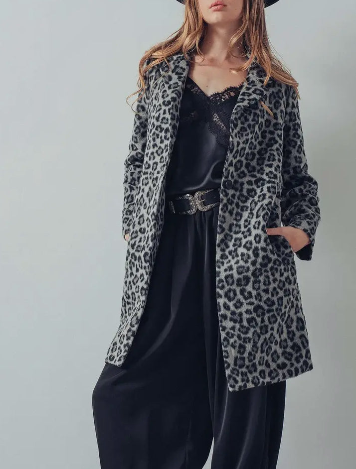 Made from the soft stretch 🐆 fabric this grey leopard jacket is the perfect pop of print for your winter wardrobe. Layer over a knit jumper and denim for everyday sophistication.