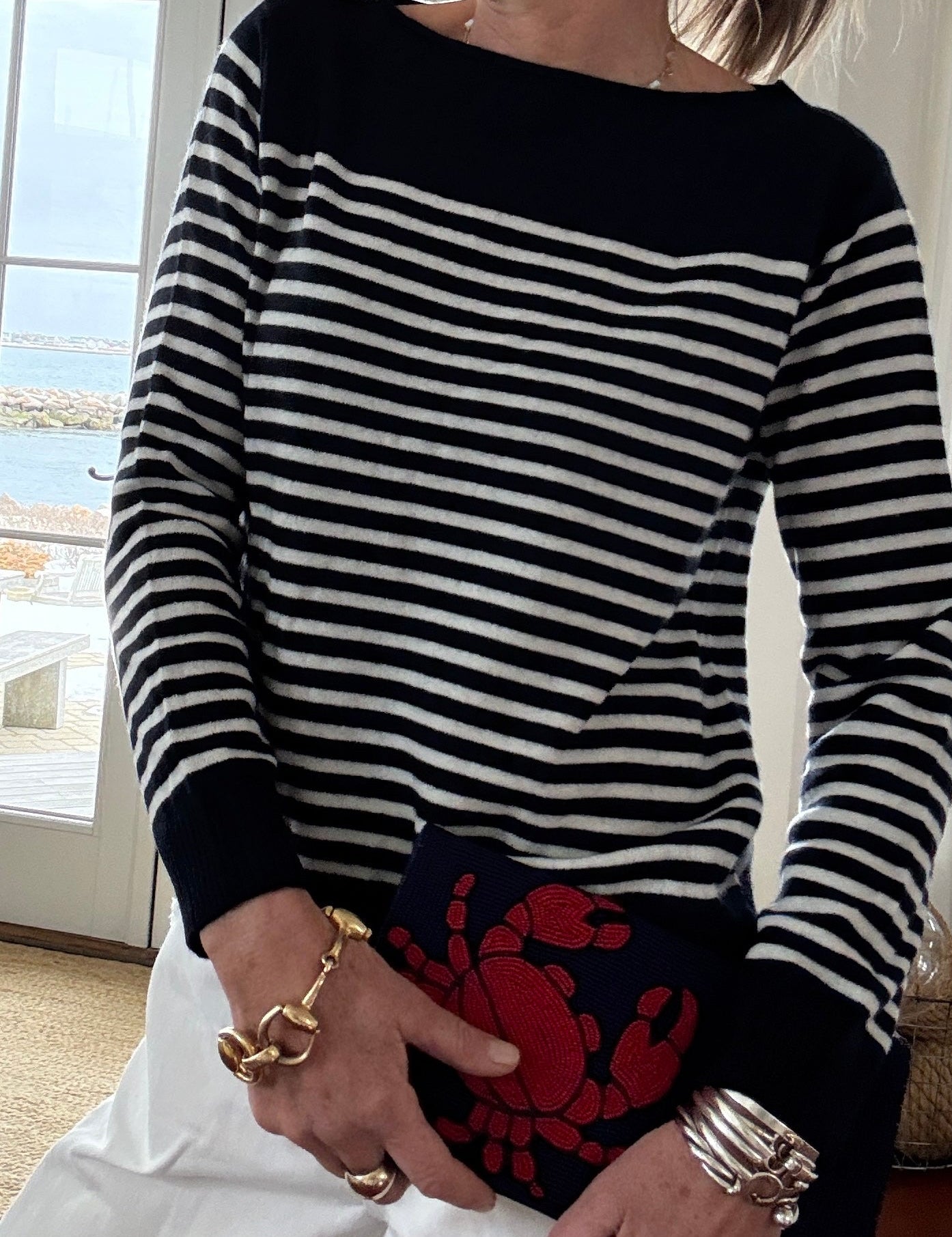 Lean Lines Boatneck 100% Cashmere Sweater Navy/Ivory