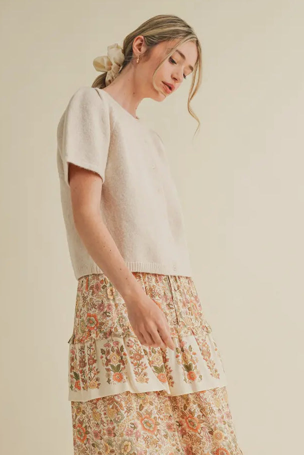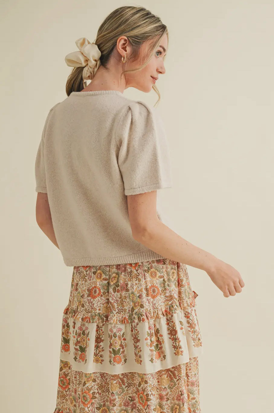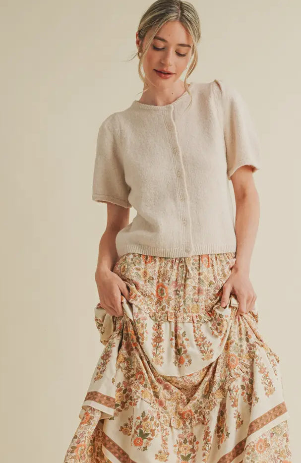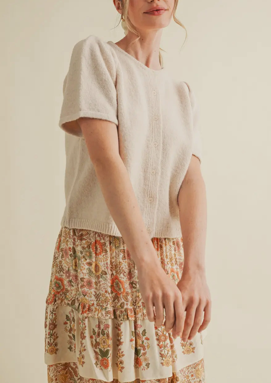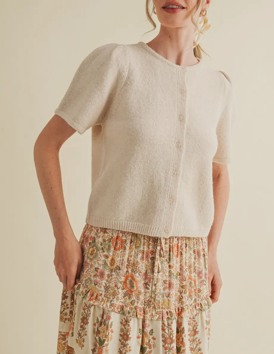 Soft, cozy, and timeless, this Short Sleeve Button Cardigan is a layering essential you’ll reach for season after season. Made from a lightweight knit with a flattering silhouette, this button-front cardigan features a modest crew neckline and puff sleeves for a flattering and flirty update. It’s the perfect blend of elevated comfort and versatile styling for everyday wear.