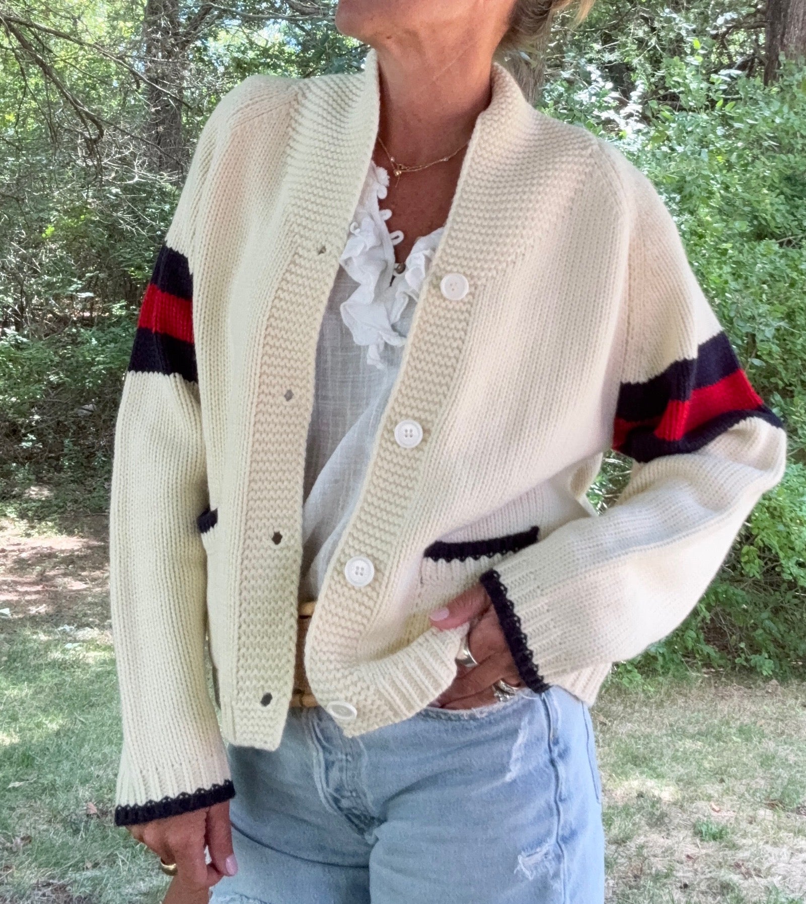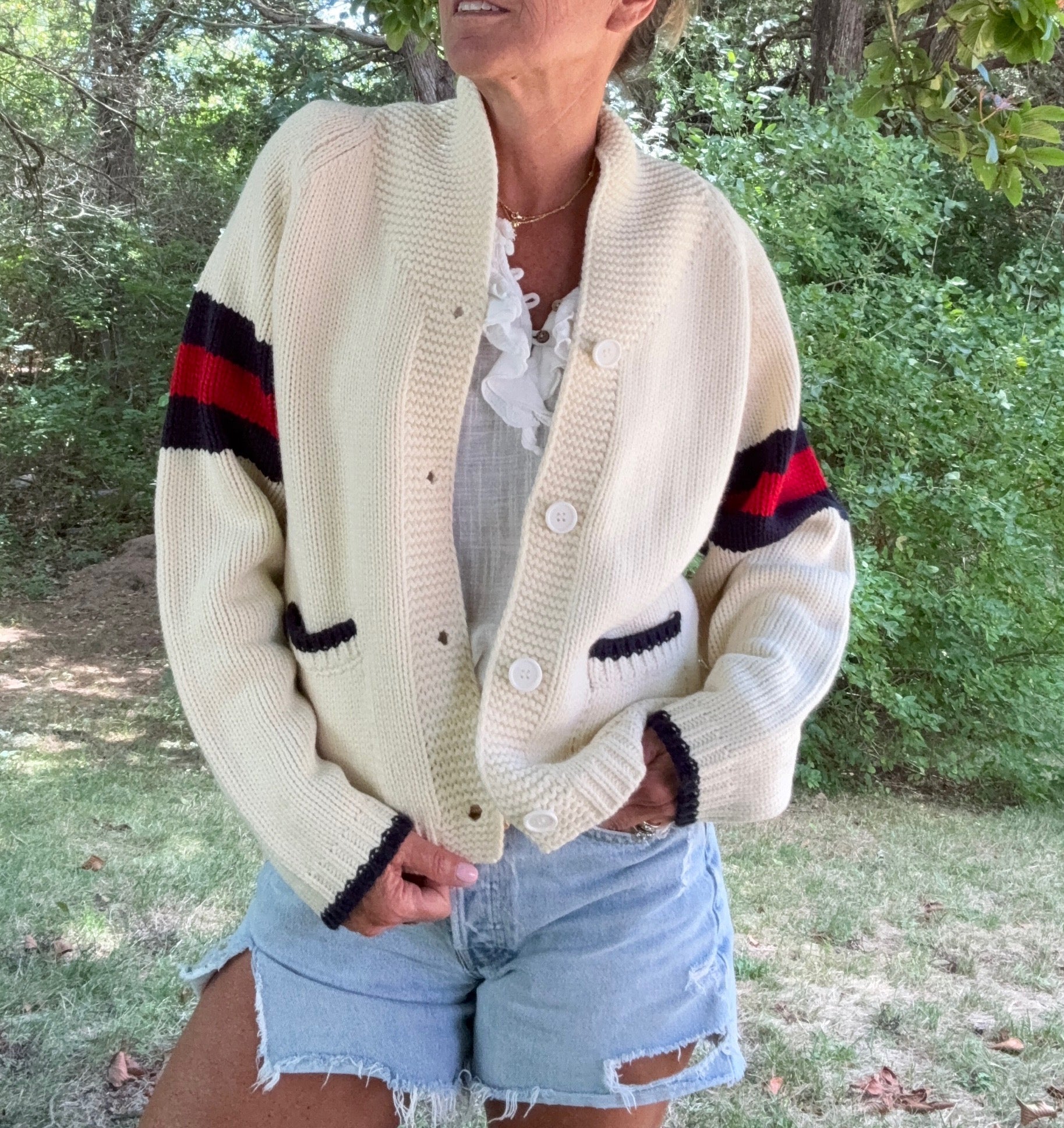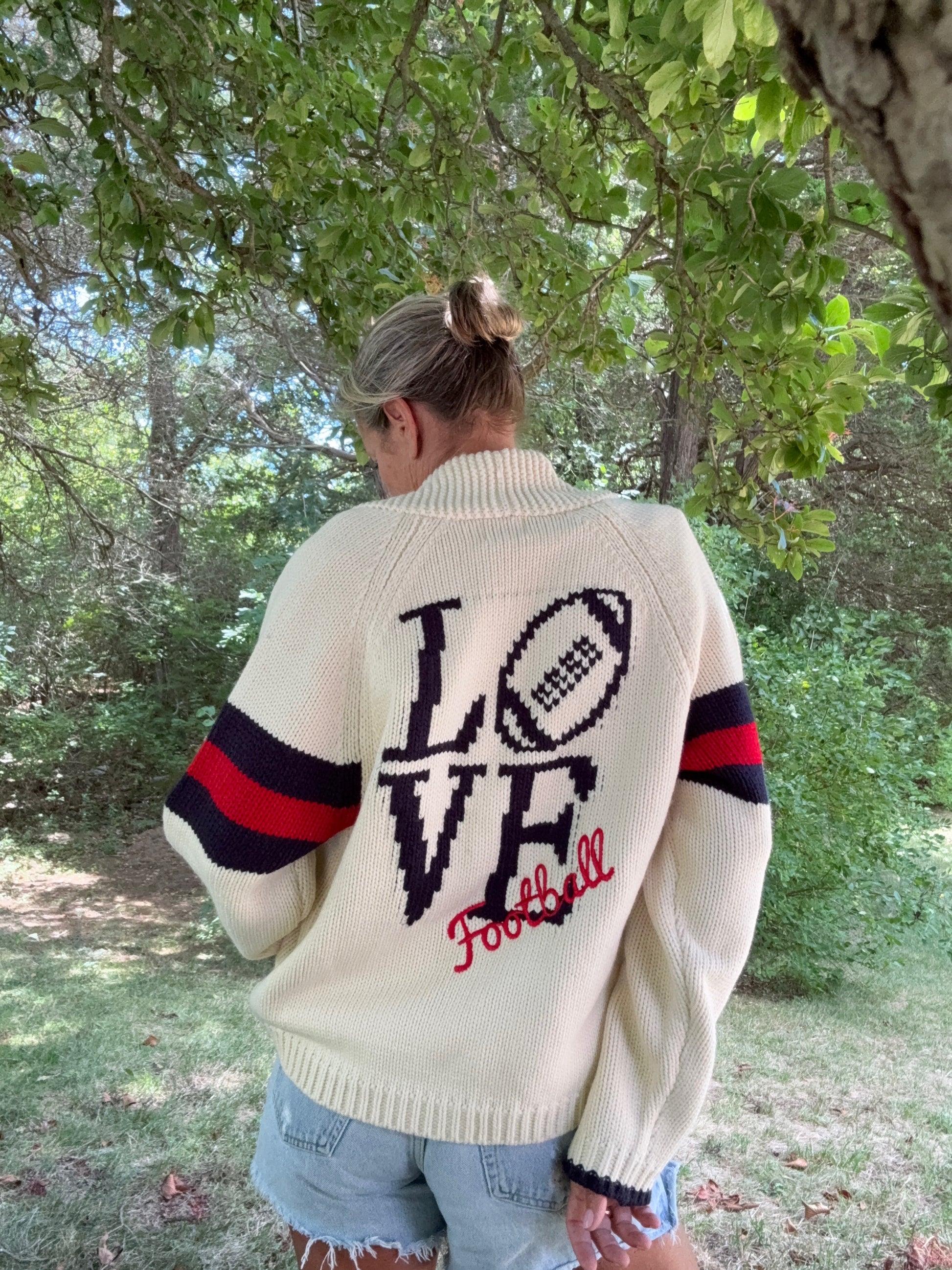Calling all Football Lovers - This Fan Fanatic Football Varsity Cardigan is our newest addition to our Pink Pineapple Collection! Featuring Red and Navy Striped Sleeves on our classic Ivory Cardigan, The word "Love" and embroidered "Football" in red stitching across the back!