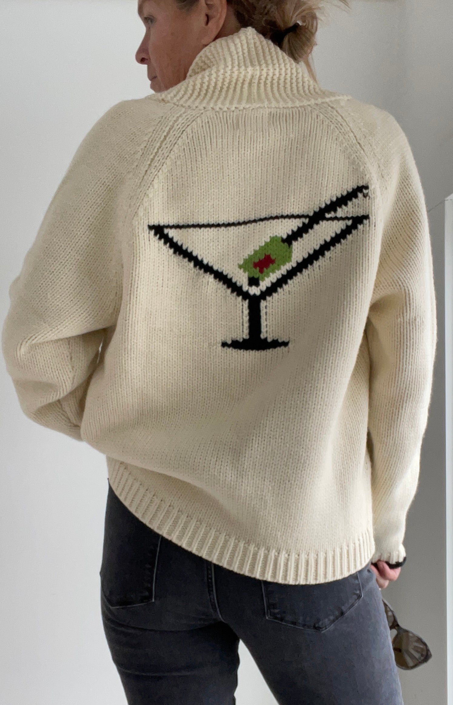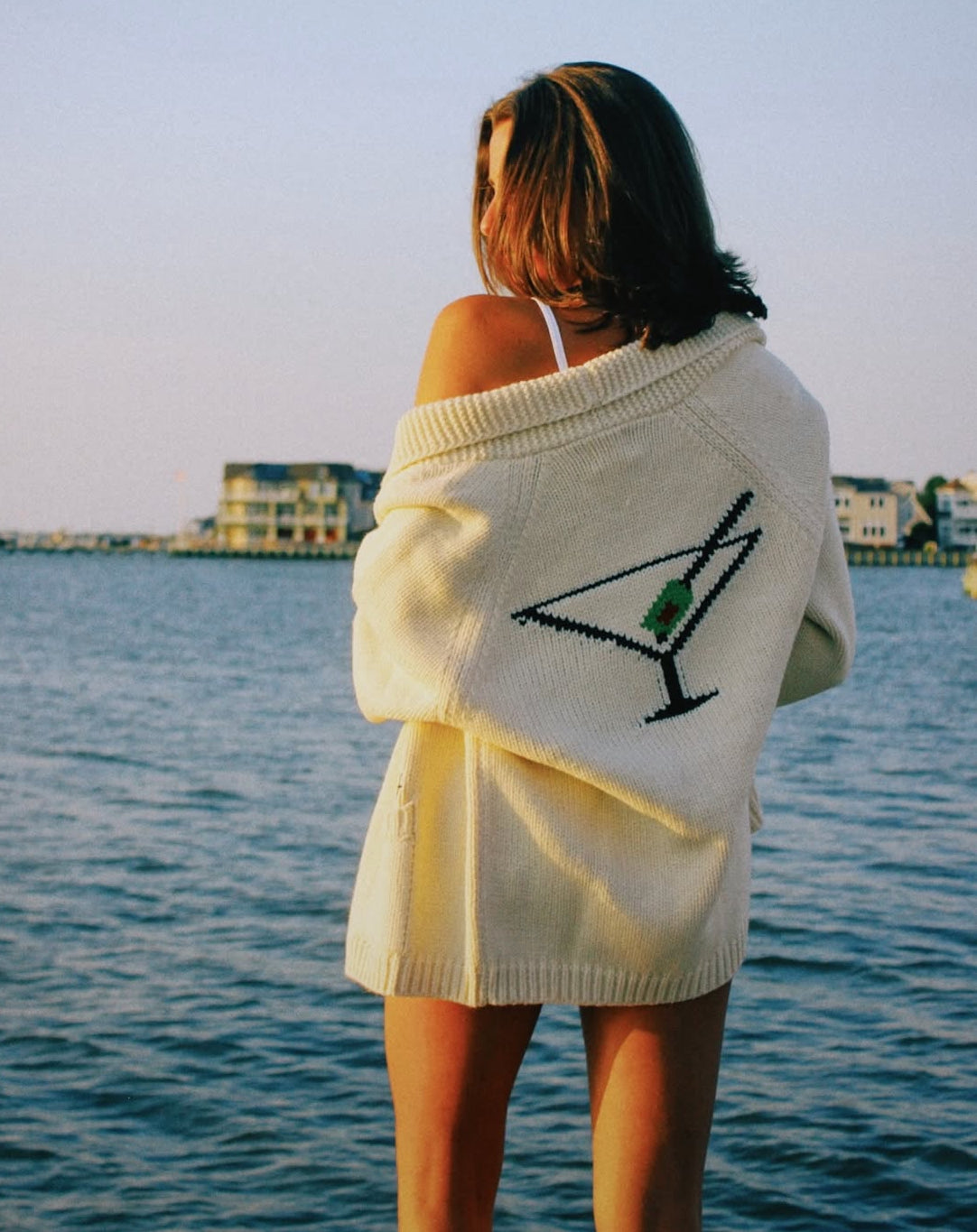 For breezy days on the boat, or chilly winter evenings on the mountain, reach for this charming cardigan - with its bold Martini motif on the back - and the word Dirty embroidered  above the pocket, it's the perfect layer to suit any season. This classic varsity duffle cardigan is so cozy you’ll find it hard to take off!