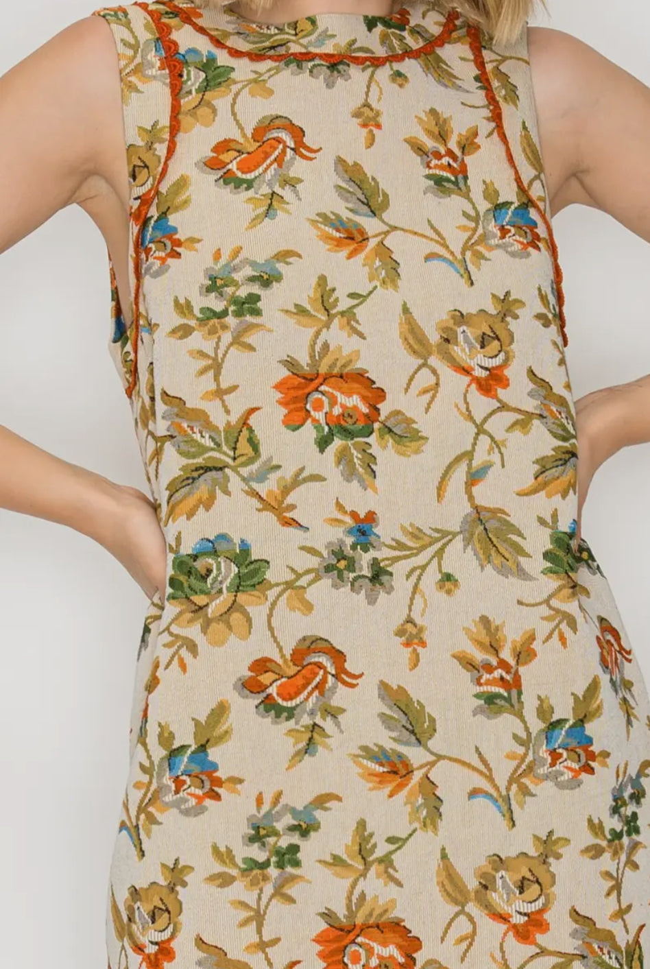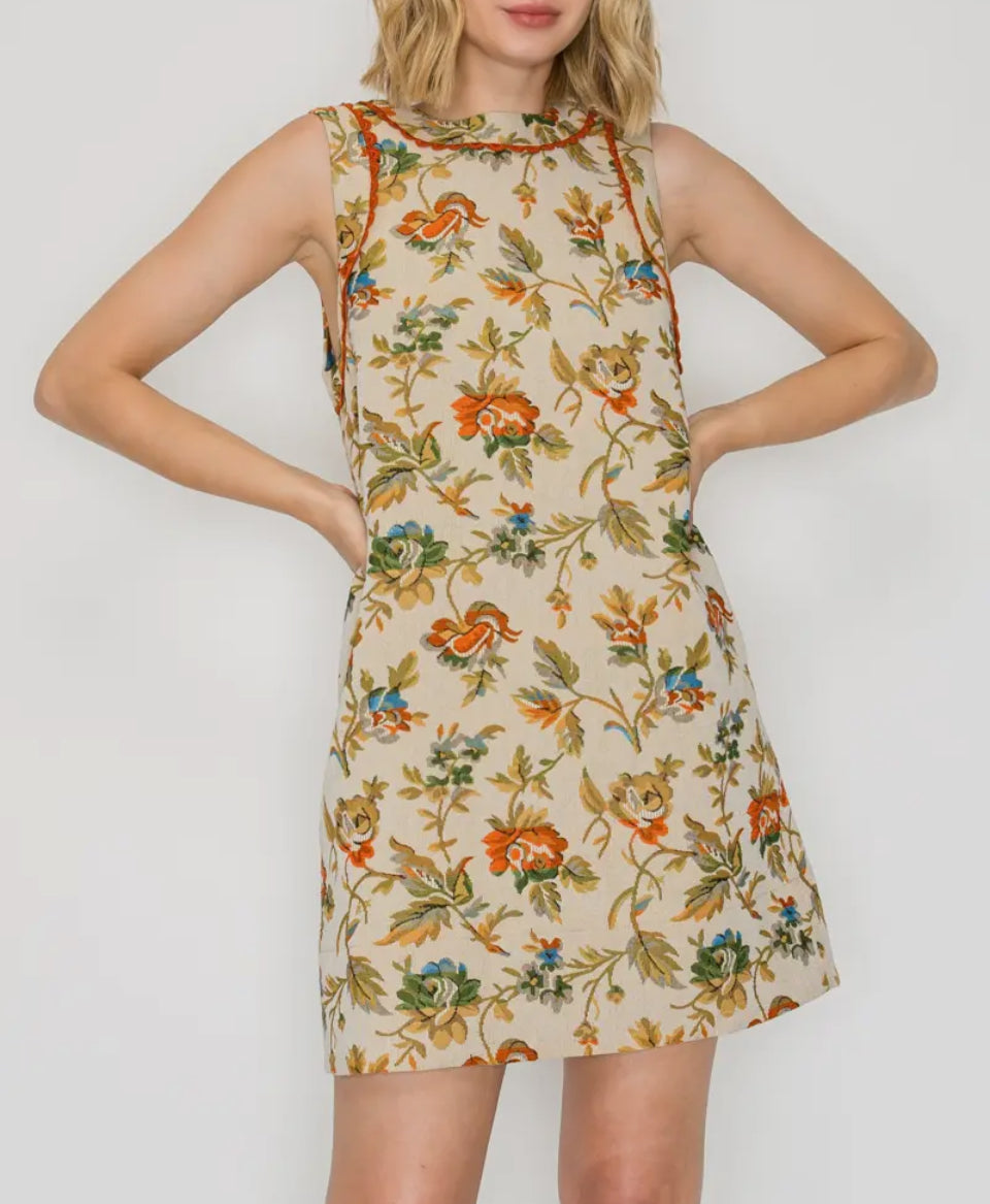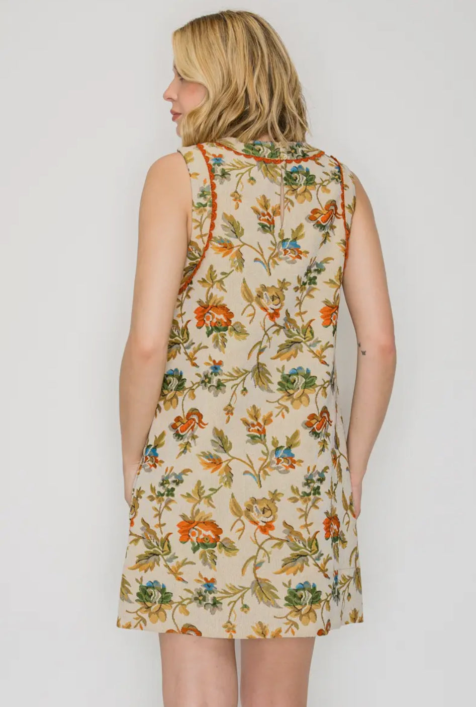 The miss Scarlett Dress is a tapestry of fall itself — woven with a floral-and-leaf motif that feels timeless yet modern. Trimmed with rust lace at the neckline and arms, this sleeveless shift silhouette is finished with thoughtful details like side pockets and a back keyhole with two buttons. Perfect for everything from crisp daytime strolls to cozy evening gatherings