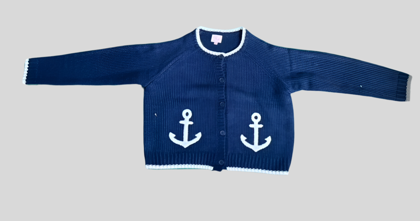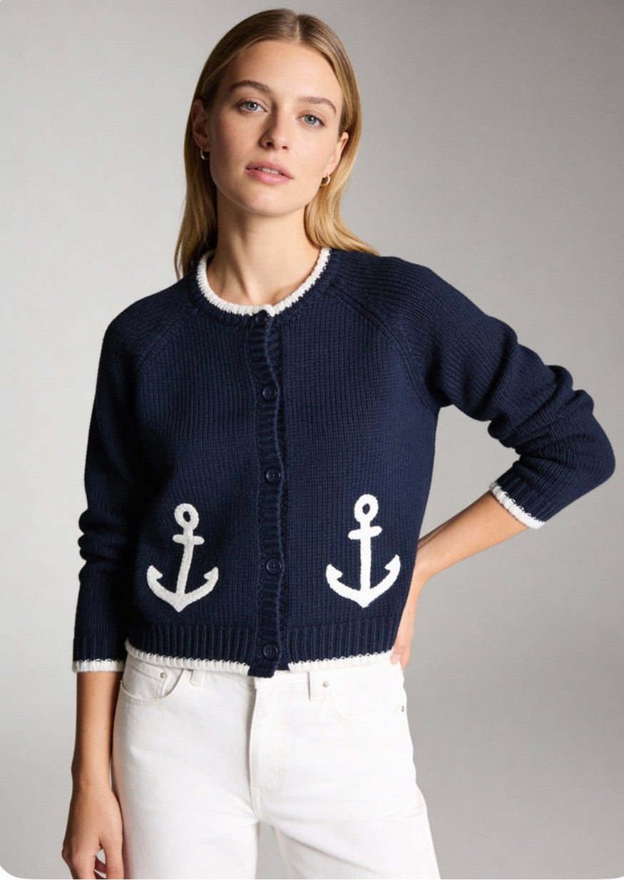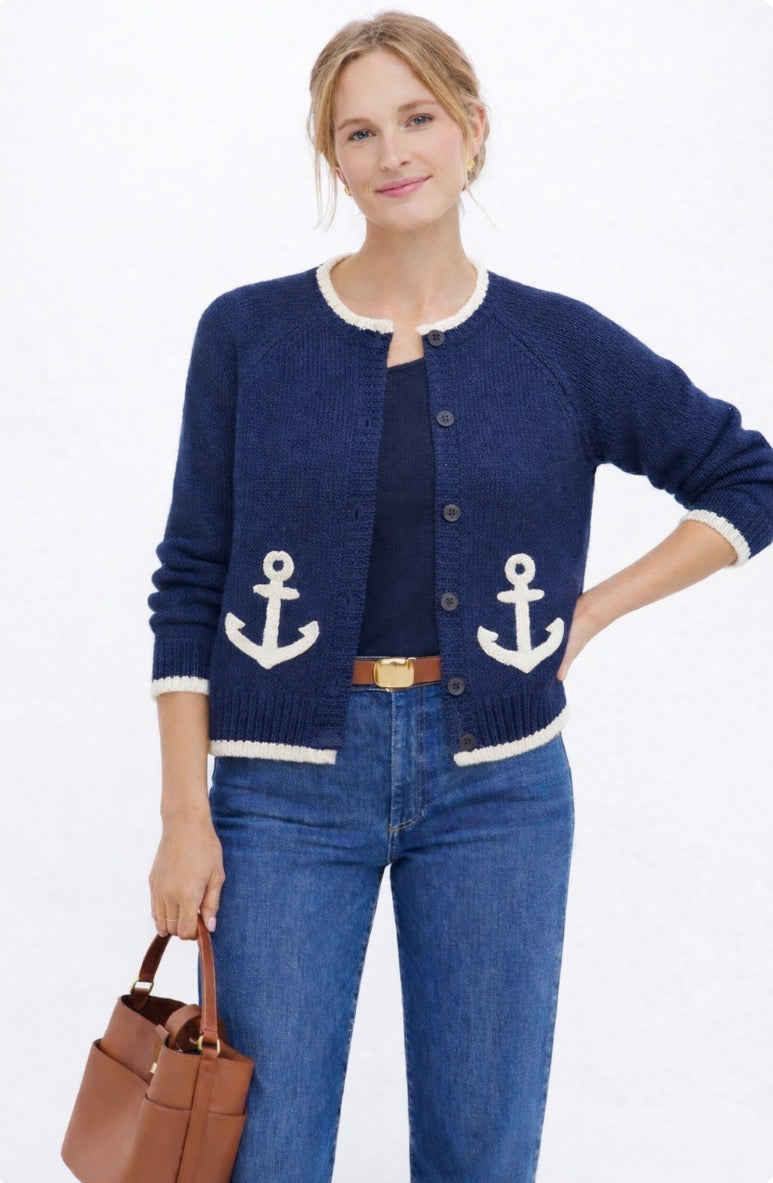 This navy cardigan features charming sailboat detailing, a soft knit hand-feel, and an easy, flattering fit. Finished with a button-front closure, it's perfect for layering over tees, shirts, or dresses from season to season. Effortlessly polished, endlessly wearable — a true coastal classic.