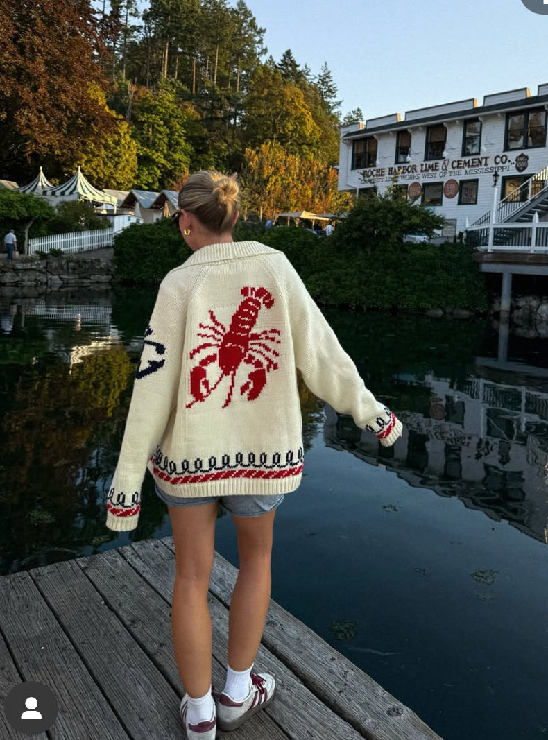 Dive into the warmth of our cozy Varsity Cardigan and make a statement at your next summer lobster bake! This snug duffle cardigan isn't just another layer; it's your best companion for those breezy seaside evenings and laid-back gatherings with loved ones. Crafted with love and care, the lobster motif on the back adds a playful touch to this classic piece, ensuring you stand out while staying toasty.