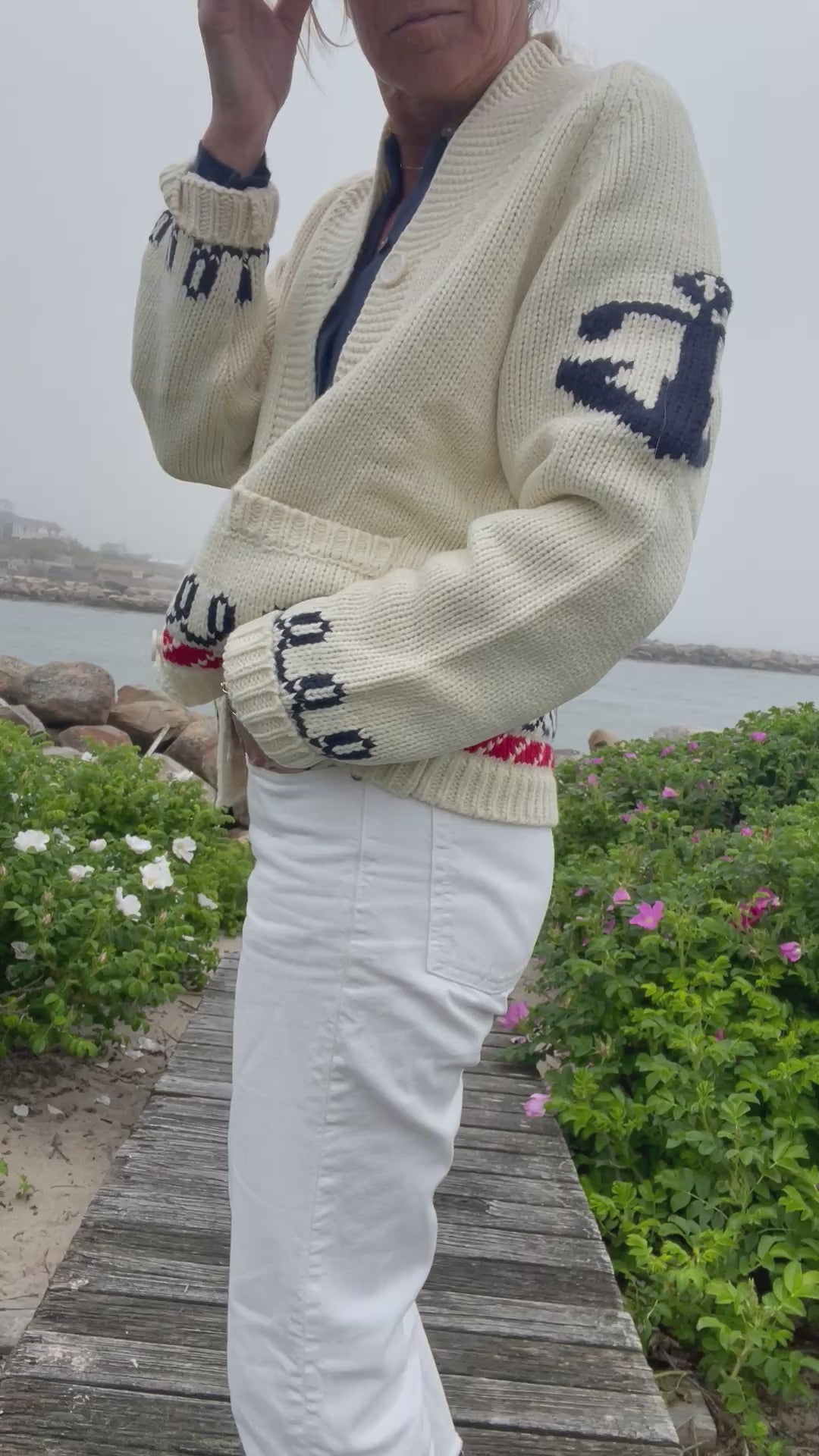 Lobster Varsity Cardigan with Vintage Trim in Ivory/Red