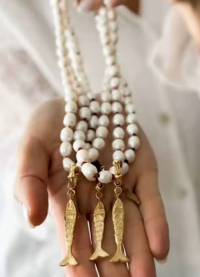 Serene yet bold, this necklace combines freshwater pearl with red stone accents with our gold fish charm. The result is a fresh contrast of textures and tones — minimal, coastal, and radiant. We use natural pearls, so they may slightly vary in size and shape.