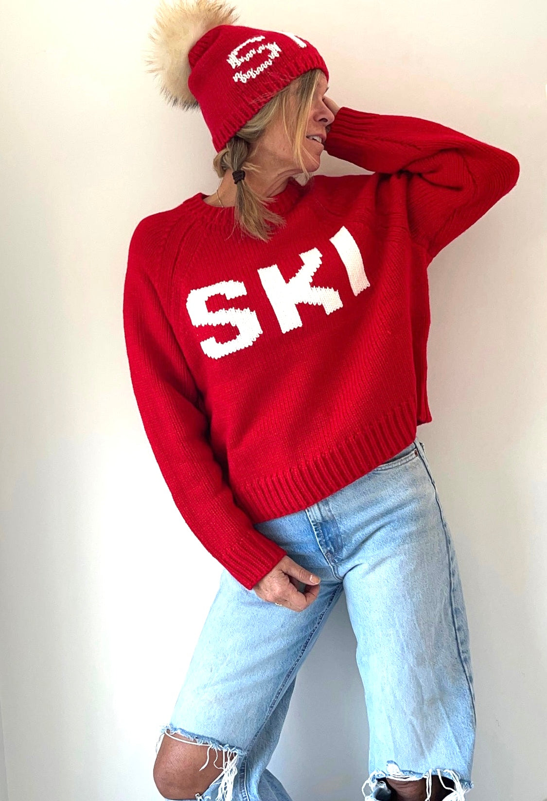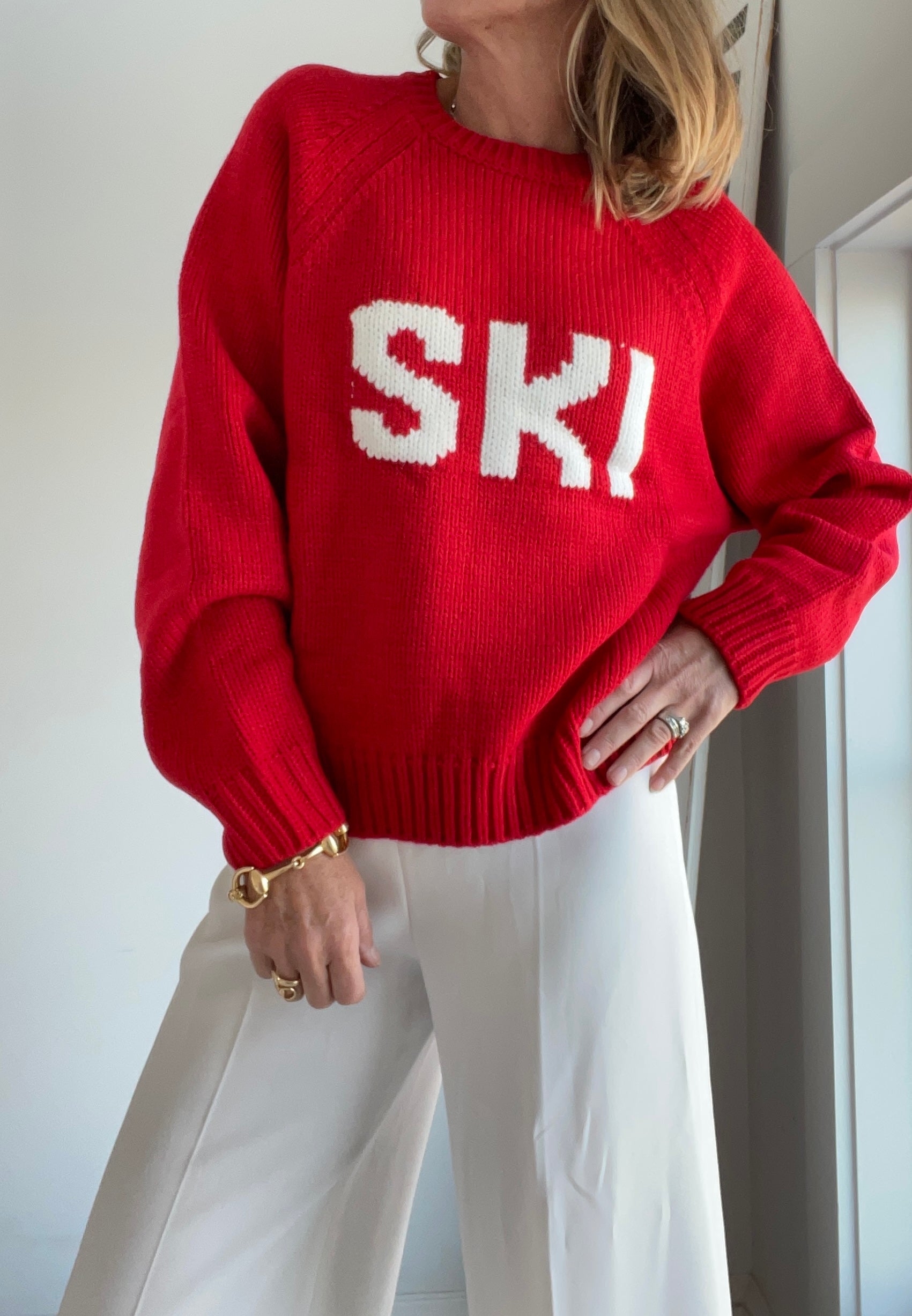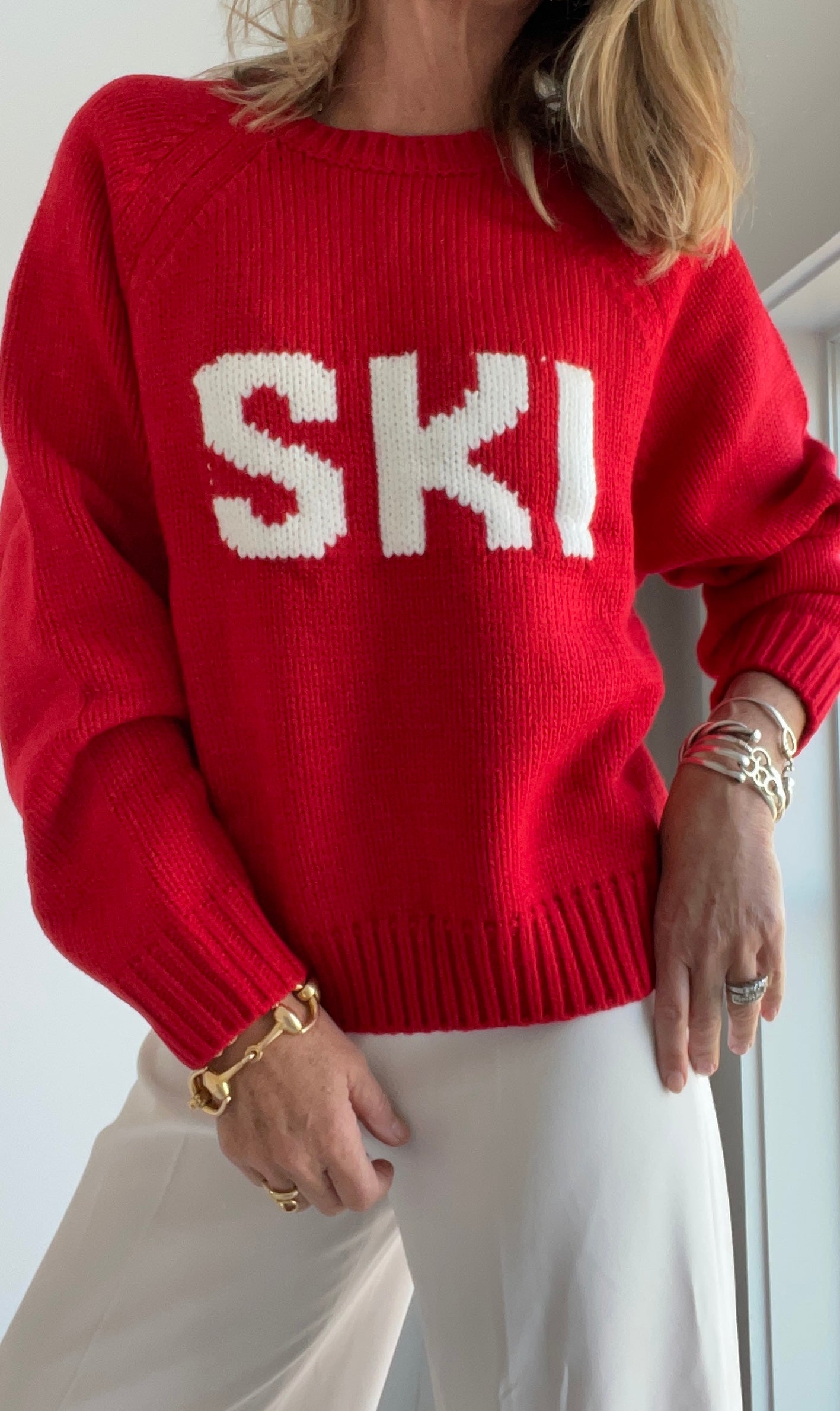 Classic raglan acrylic crew with SKI knit on the Front. This carefully crafted chunky sweater is knit from a thick 100% acrylic for easy care and YEARS of wear. For sure to be a go-to staple all winter long.