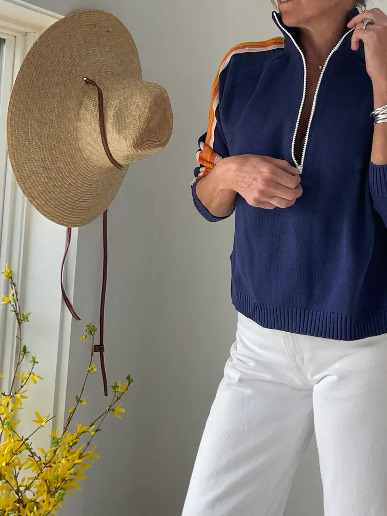 Our NEW, half zips, are our contemporary take on the quarter zip. Contrast zipper. Slightly boxy, hits hip length. Navy and Orange stripes down the sleeve make this sweater a classic.