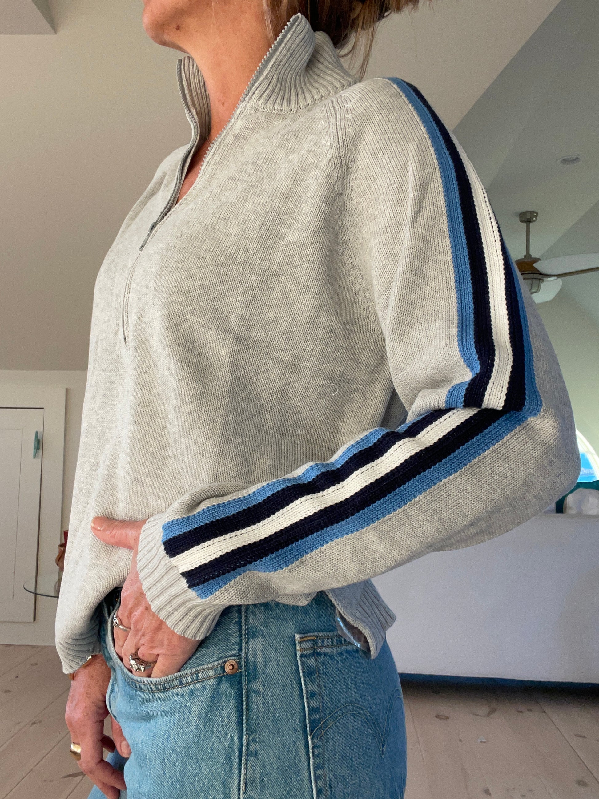 Our NEW, half zips, are our contemporary take on the quarter zip. Contrast zipper. Slightly boxy, hits hip length. Faded Navy and retro stripes down the sleeve make this sweater a classic.