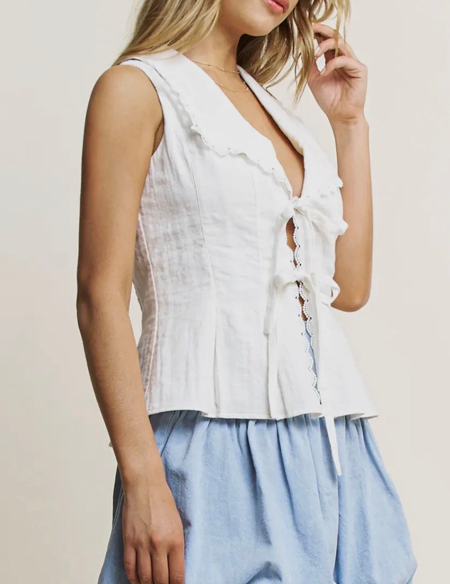 The Summer Romance White Lace Tie Front Blouse — A dreamy piece that blends romance with effortless charm. Crafted in 100% cotton, this blouse features delicate scallop-edge lace details along the collar and a tie-front vest design that feels feminine yet versatile. Perfect for pairing with denim for a casual day out or with the coordinating maxi skirt for an instantly elevated set, it’s your go-to for a done-in-one look no matter the occasion.