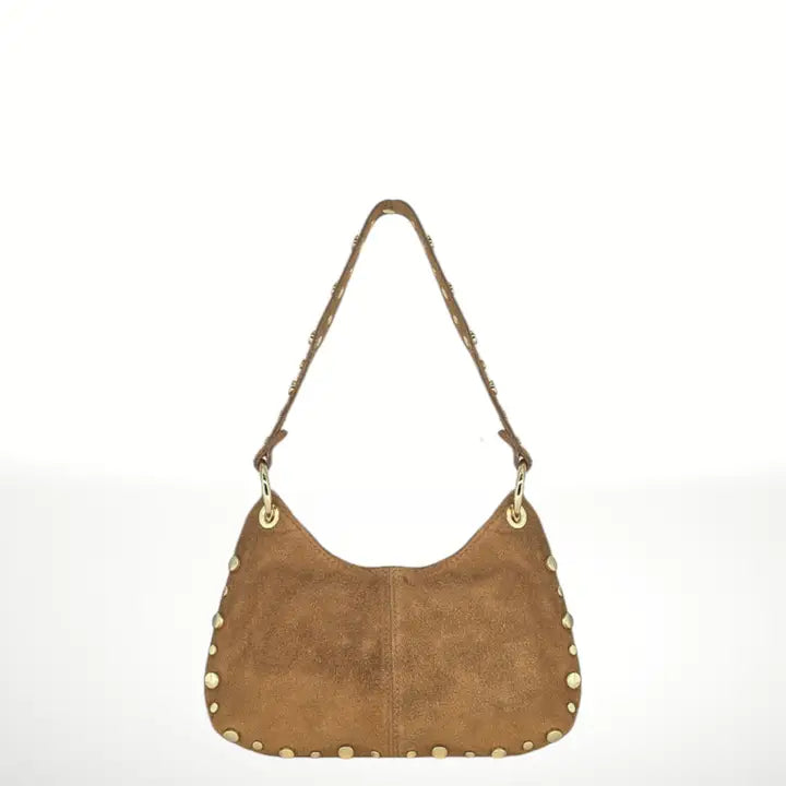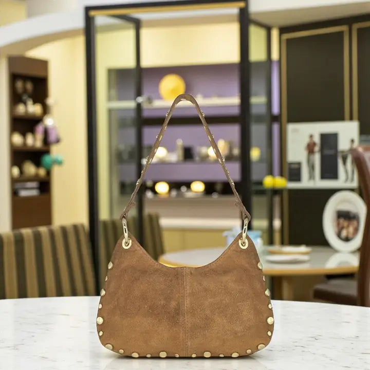 Contemporary-inspired hobo bag, crafted from genuine cow suede leather, with a soft touch and natural appearance. Its flexible structure and harmonious drape give it an informal yet refined look, ideal for both daily use and an elegant urban style. The metal appliqués distributed along the front and side edges create a decorative contrast that highlights its artisanal character and distinctive design. This model combines comfort, design, and durability in a single piece.