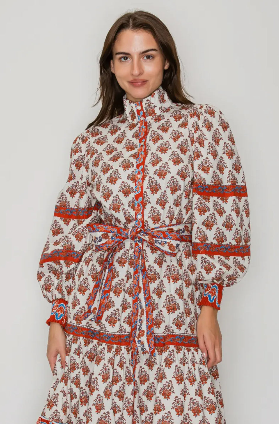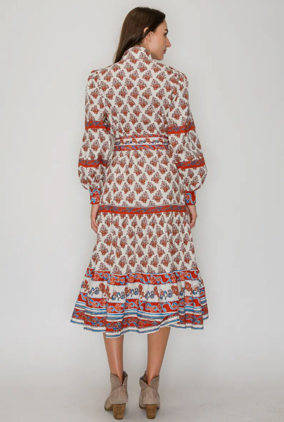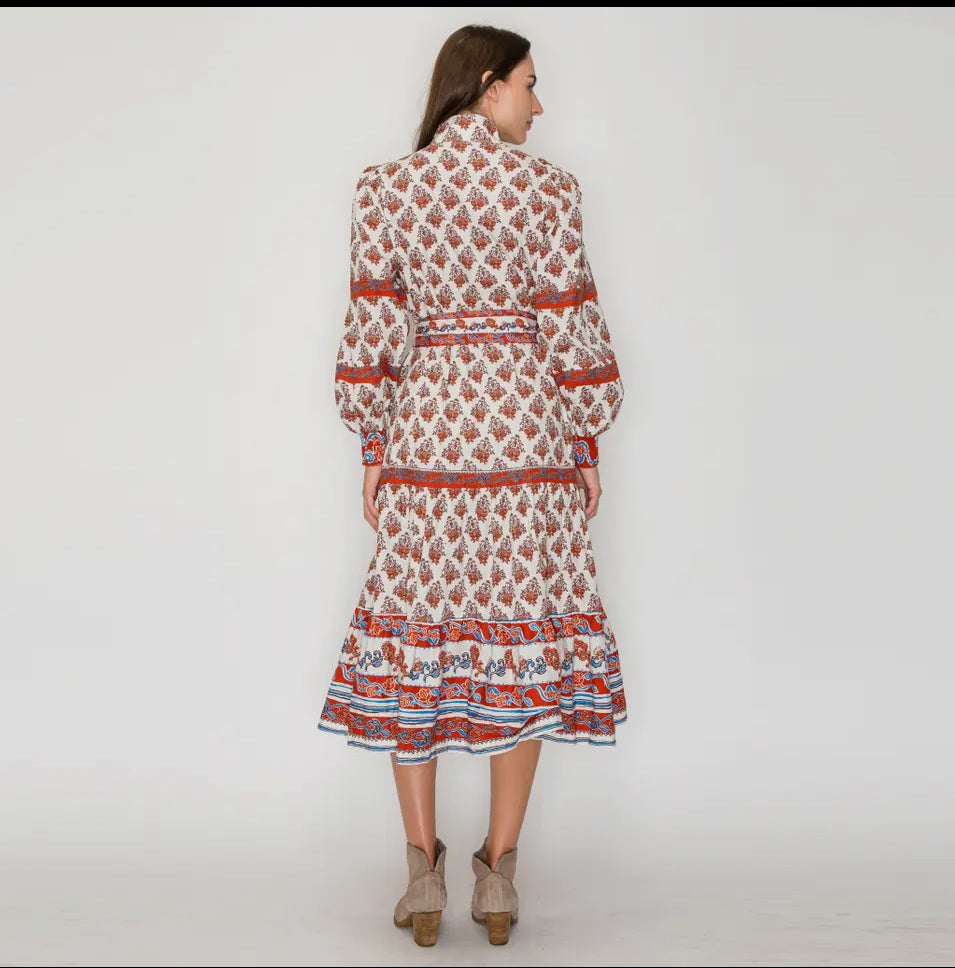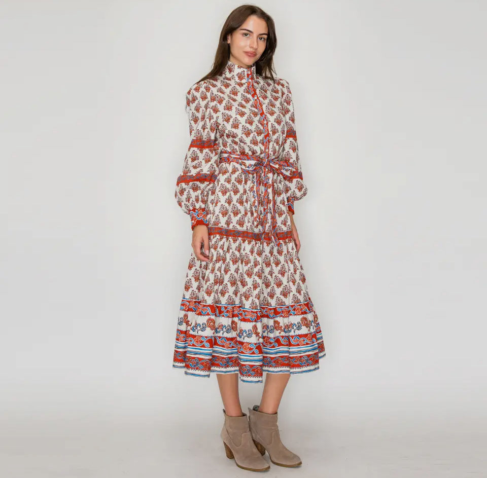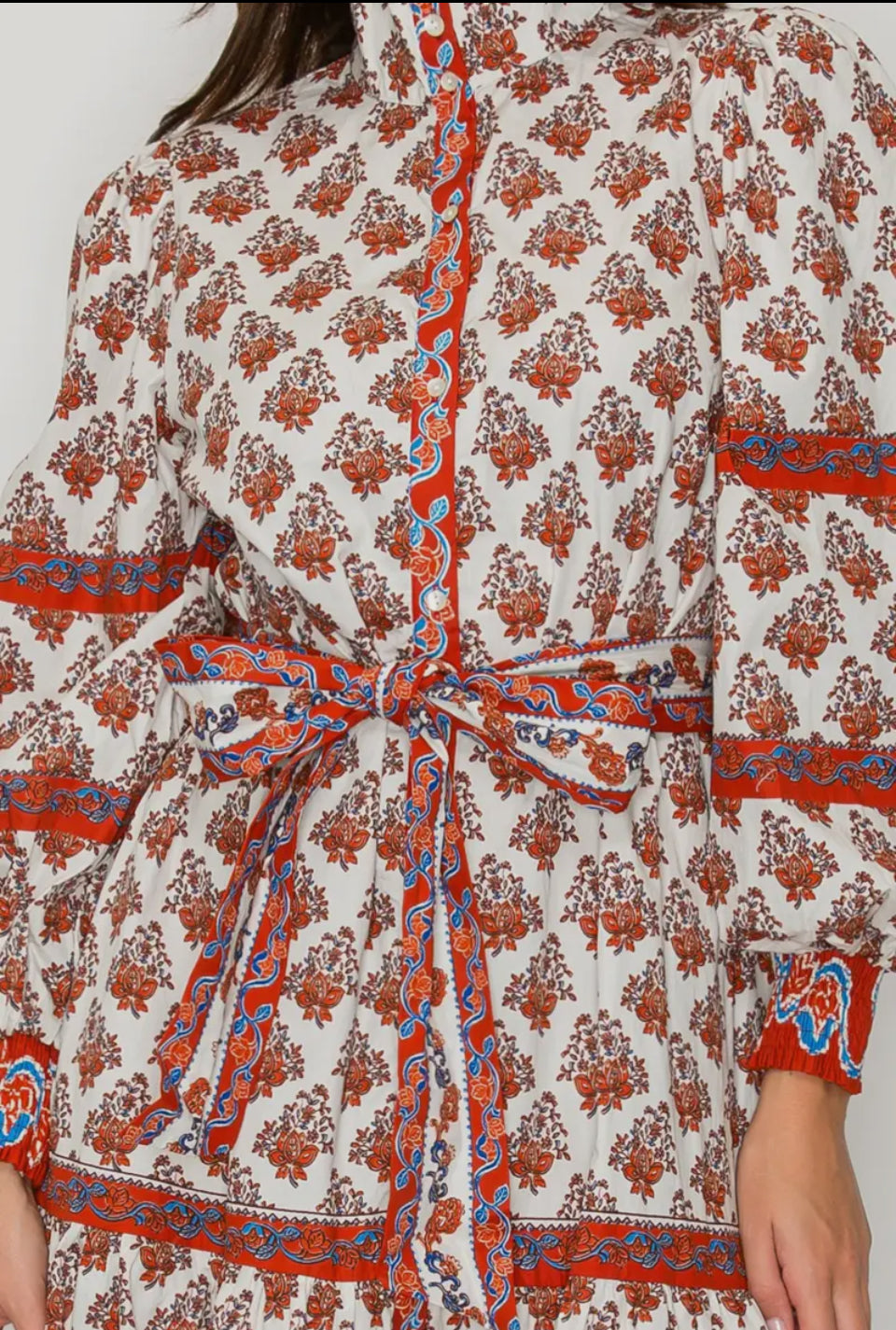 A poetic fusion of artful prints and effortless elegance — this dress is crafted from 100% breathable cotton with a soft, natural drape. The fully open shirt-front design adds versatility, while the belted waist and side pockets bring both ease and structure. Delicately accented with earthy terracotta and sky-blue tones, this piece evokes a sense of wanderlust and timeless femininity. Perfect for spring days, weekend escapes, or simply feeling beautiful in the everyday