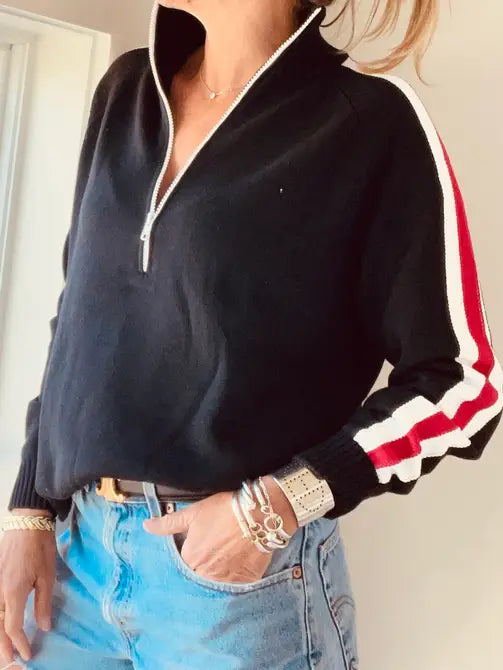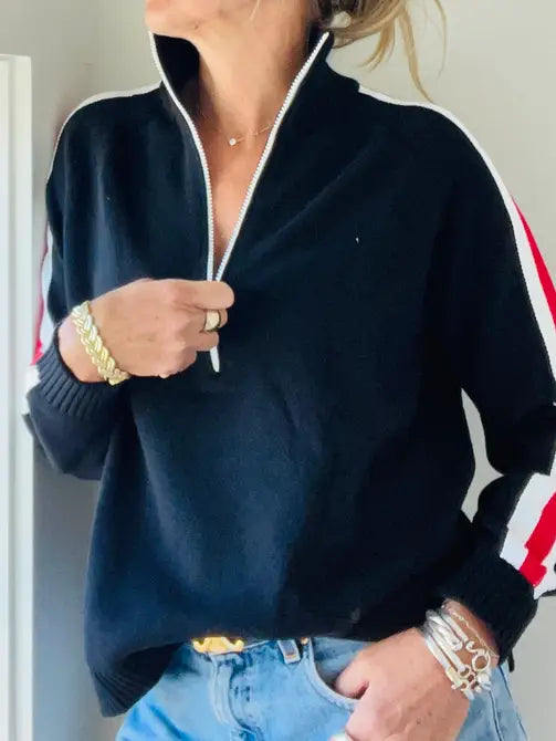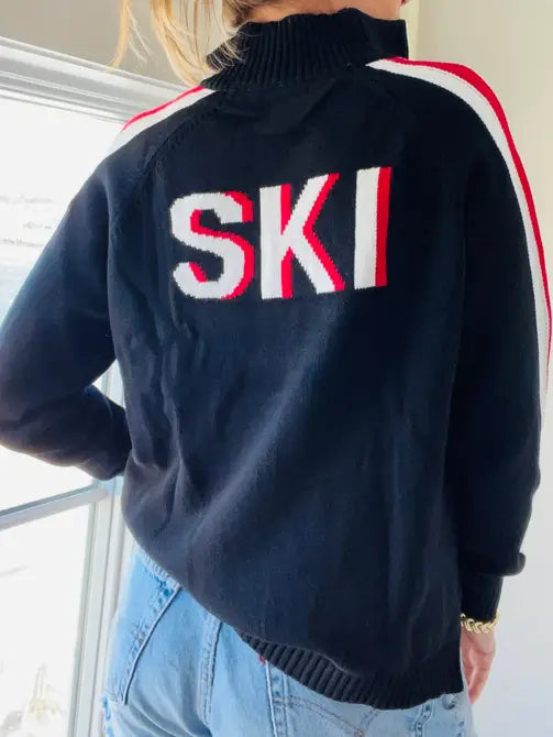 Our favorite Fall Cotton sweater in a classic black white and red - racing stripes down the sleeves a pop of white on the zipper and SKI on the back - LOVING this and it is also available in white!